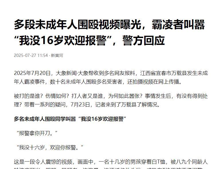 江西万载,一男孩遭到八九个同龄人的围殴,他跪地求饶但换来的是更长时间的殴打。短短地5分钟内,男孩遭到62次掌掴,48次脚踹。施暴者们还嘲笑男孩说:“你如果敢报警,就拿你开刀。”“我没16岁,欢迎你报警。” 据新黄河7月27日报道,这伙人已经被抓了起来,警方通报称有6名违法行为人因未满16周岁而不予行政拘留处罚。 对于警方的通报,不少网友质疑:明明视频中有八九个人,为什么却只抓了6个人? 为此,在6月26日,警方再次回应称:涉事人员全部抓捕到位,并对他们做出了行政处罚。 而对于警方的回应,又有不少网友质疑前后矛盾,明明是6个人未满16周岁不处罚,怎么又全部处罚了? 其实警方的通报并没有什么问题,只是大家对行政处罚以及行政拘留处罚的细节还没搞明白。 本事件中,警方通报的是未满16岁的人,没有进行行政拘留处罚。 按照《治安管理处罚法》第23条第1款第1项规定,已满十四周岁不满十六周岁的,依照本法应当给予行政拘留处罚的,不执行行政拘留处罚。 第51条规定,结伙殴打他人或殴打不满14周岁的未成年人的,处10日以上十五日以下拘留,并处1000元~2000元罚款。 也就是说,警方对违反治安管理规定的处罚,应当是拘留、罚款、批评教育,至少是三样。 现在警方通报的是不予行政拘留处罚,这意思是罚款和批评教育的处罚仍保留了下来,只是按照规定,不能实施行政拘留措施。 因此,警方的处罚方式并没有问题。 不过,大家千万别忽略了《治安管理处罚法》第23条第2款的规定。 该规定显示,如果有已满14周岁未满16周岁的未成年人实施了治安违法行为,情节严重,影响恶劣的,或者一年内有两次违反治安管理规定的行为,则不受第23条第1款的限制。 对于情节严重,影响恶劣的,这没什么好讲的,情节是否严重,影响是否恶劣在警方那有一套认定标准,通俗点来讲,就是警方说严重就严重,说恶劣就恶劣,需要看警方的判断。 对于一年内有两次违反治安管理行为的,是指此前因违反治安管理行为被处罚过,当时没有行政拘留,之后再次违反治安管理规定的,则不需要再考虑是否年满16周岁,必须予以行政拘留。 这样看来,未满16周岁并非免罚金牌,只要条件符合,还是可以行政拘留的。 我们回观本次事件,这八九名同龄人对着男孩拳打脚踢,的确有些无语了,但是否达到情节严重,影响恶劣,我们无法去评判这个标准。 因为这个评判权一旦到我们手中,那肯定是按照最严厉的处罚来处理,无法做到理性客观。 最后,未成年人是需要法律来保护,不过这种保护应当有一定的限度,不能未成年人违法了,还去保护他,那这个法律不就变成恶法了吗?虽然恶法亦法,但恶法是得不到公众认同的。 对此,您怎么看?#头号创作者激励计划#