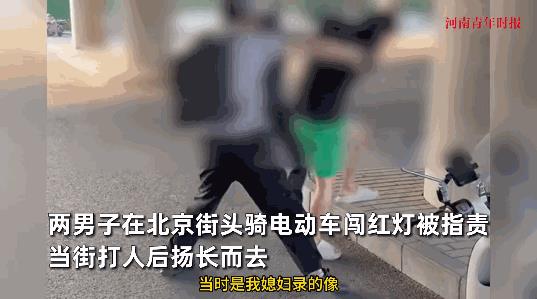 “严查到底!”2025年7月,北京,一夫妻俩骑车在路上正常行驶,却突然被两位闯红灯的男子差点撞到!丈夫指责了一句对方,谁知他们却直接下车对丈夫大打出手,丈夫全程没还手,生怕被认为是互殴,可没想到两个打人的男子却事后扬长而去! 不管是开车还是骑车,等红灯都是最基本的原则,闯红灯本来就已经属于是违反交通规则了,在被别人指责了之后,甚至先动手打人,这更是罪加一等! 事发当天,这两位男子一起骑车行驶时,在路过一处红绿灯路口,突然就闯了红灯,旁边道路上正常骑车的夫妻俩,因为他们闯了红灯,差点就撞在了一起。 丈夫看到这一幕后,就告诉他们骑车看着点,怎么还闯红灯呢,可谁知就是因为这样一句话,却点燃了两个男子的怒火,他们二话不说就从电动车上走下来,然后对着丈夫一顿殴打。 妻子在旁边吓得赶紧录像,可两个人却仿佛有恃无恐,在打完人之后,两个人又骑着车扬长而去,而丈夫为了保护妻子,全程没有还手,可以说单方面的被殴打了很久。 事后他们根据车牌号去寻找肇事车主,可是快一个月时间了,也没有任何头绪,这让夫妻俩都有些心灰意冷,如今丈夫全网寻找这两个车主的信息,毕竟他不能白白的挨了这么一顿殴打! 而经过鉴定,丈夫身上的伤势是轻微伤,虽说算不上很重,但是这两个闯红灯还打人的车主,行为性质已经和普通的吵架完全不同了! 信息来源:《2男子闯红灯被指责,当街打人后扬长而去,被打者全网寻人:已报警,我全程没还手》法治进行时