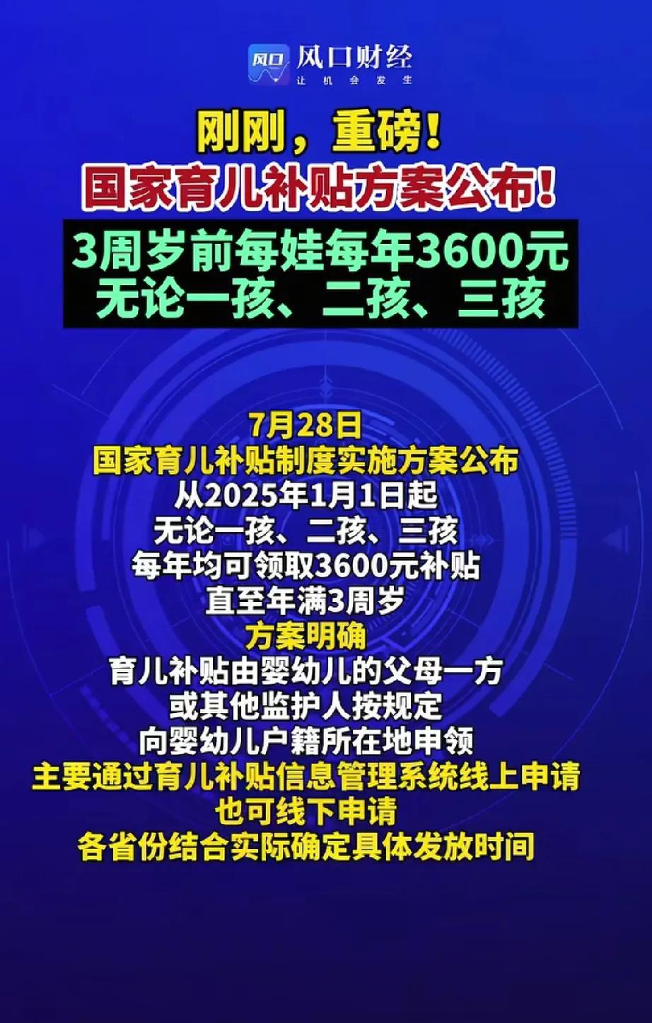 年轻人,这回你就放心的生孩子吧。看看这补贴多大呀。 以前怕这怕那,现在这么好的政策出台了,你就放心吧。从2025年1月1日起,三周岁以下每年补贴3600元,一个,两个,三个孩子都行,是现金补贴,现金补贴。奶粉钱绝对是没问题呀,这生育成本开始降低了。这民生政策多好呀。