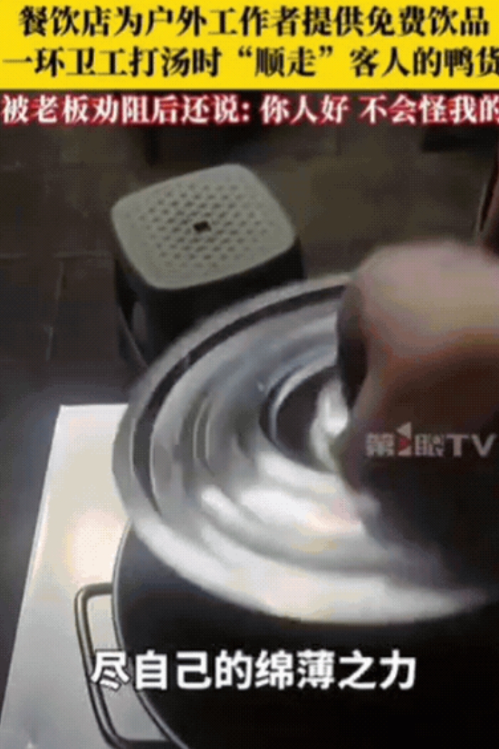 “太坏了!”7月25日,河南信阳,男子开餐馆,为户外工作者提供免费饮品,不料,环卫工打汤时,竟然“顺走”了客人的鸭货,被老板劝阻后,环卫工还理直气壮的说:你人好,不会怪我的!说完就离开了!随后老板的做法大快人心!网友:这是不知感恩的人!