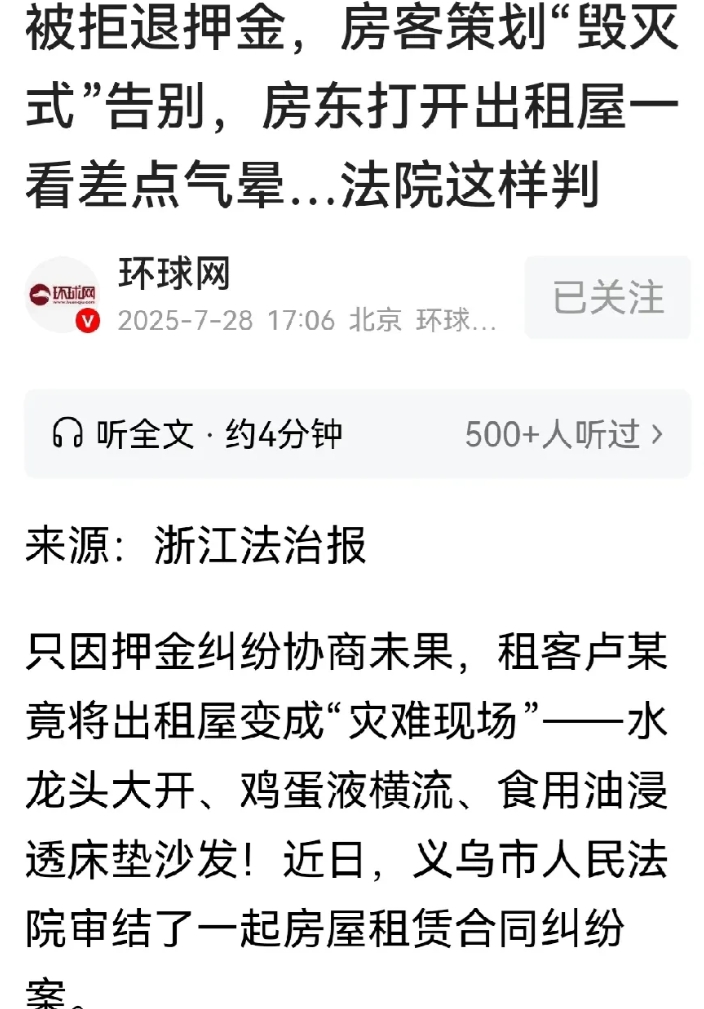 浙江义乌,男子租房,租期半年,他在出租屋里养狗,房东放话:要么你走,要么狗走!男子被逼把狗送走,房东才允许他继续住。男子觉得房东事多,想提前退租,房东又扣了他的押金。男子气炸:我花钱租房,你处处刁难?男子给房东说不退了继续住,回到出租屋,打开所有水龙头,把吃剩的鸡蛋摔在墙上、地上,把食用油倒在沙发、床垫上,扬长而去。房东愤怒之下将男子告上法庭,判决结果,男子傻眼了!