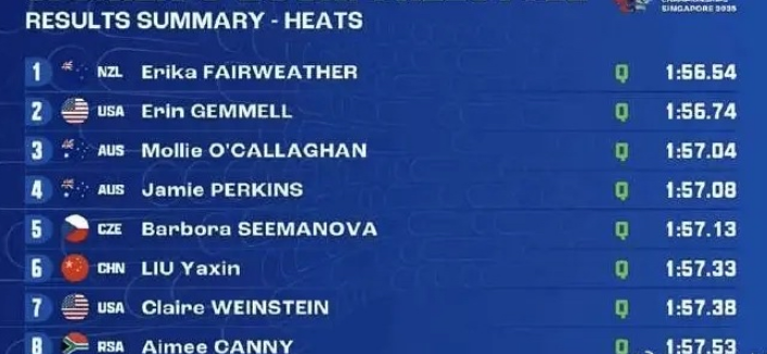 李冰洁游出1:57.57,排名总成绩第十一位,柳雅欣游出1:57.33,排名总成绩第六位,双双均顺利进入到半决赛。新西兰选手费尔维策1分56秒54获得预赛第一。