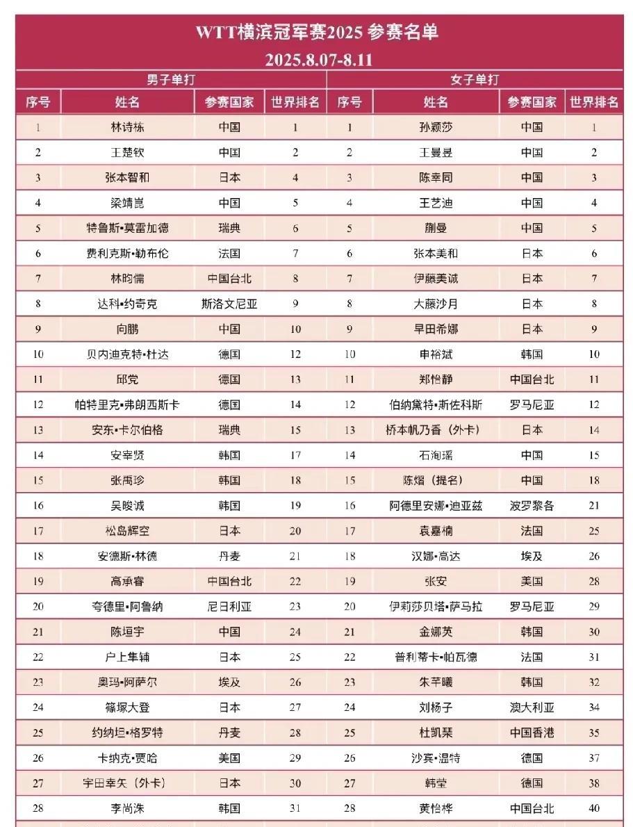 刚完乒超联赛又来冠军赛!这次的WTT横滨冠军赛要好看了! 外卡和提名给了大圣,陈