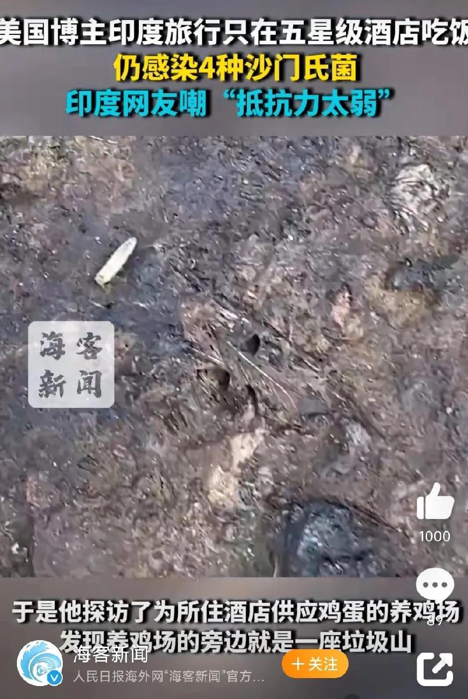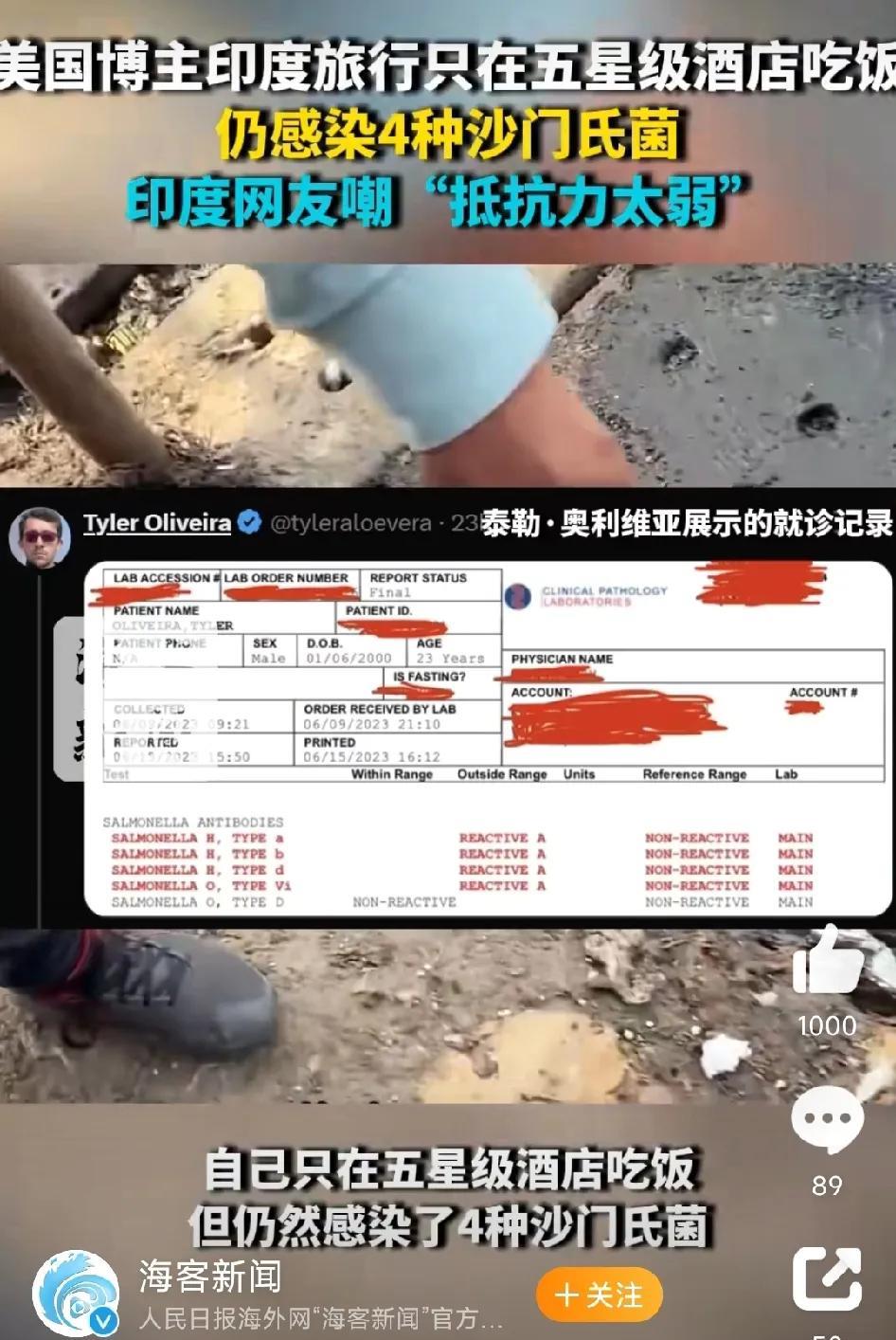 印度新德里电视台报道:近日美国博主泰勒.奥利维亚在印度旅行时,尽管他自己已经十分注意,但还是感染了四种沙门氏菌。 让人意想不到的是,这个消息可是印度媒体自己先报道出来的。 奥利维亚在来印度旅行之前就已经做足了功课,知道印度的食物、饮用水等非常不卫生,因此他特意花大价钱住五星级酒店,同时不在外面吃东西,喝水。本以为这样就可以保证自己的安全,但是让他万万没有想到,就算住进每晚100美元的五星级酒店,他最后还是在劫难逃,感染了四种沙门氏菌。 印媒报道了奥利维亚在印度的遭遇后,反而遭来印度网民的群嘲。他们纷纷嘲笑是奥利维亚自己的抵抗能力太差了,并不是印度的食物、饮水、空气和环境有任何问题,他们甚至要求奥利维亚为后抹黑印度而道歉! 就问你服不服。 想到前不久甲亢姐高调宣布,印度对中国游客恢复签证之后,估计大量的中国人会马上涌入印度,至少会有上百万中国人来印度旅游。看了这个报道,就问你敢不敢去印度?