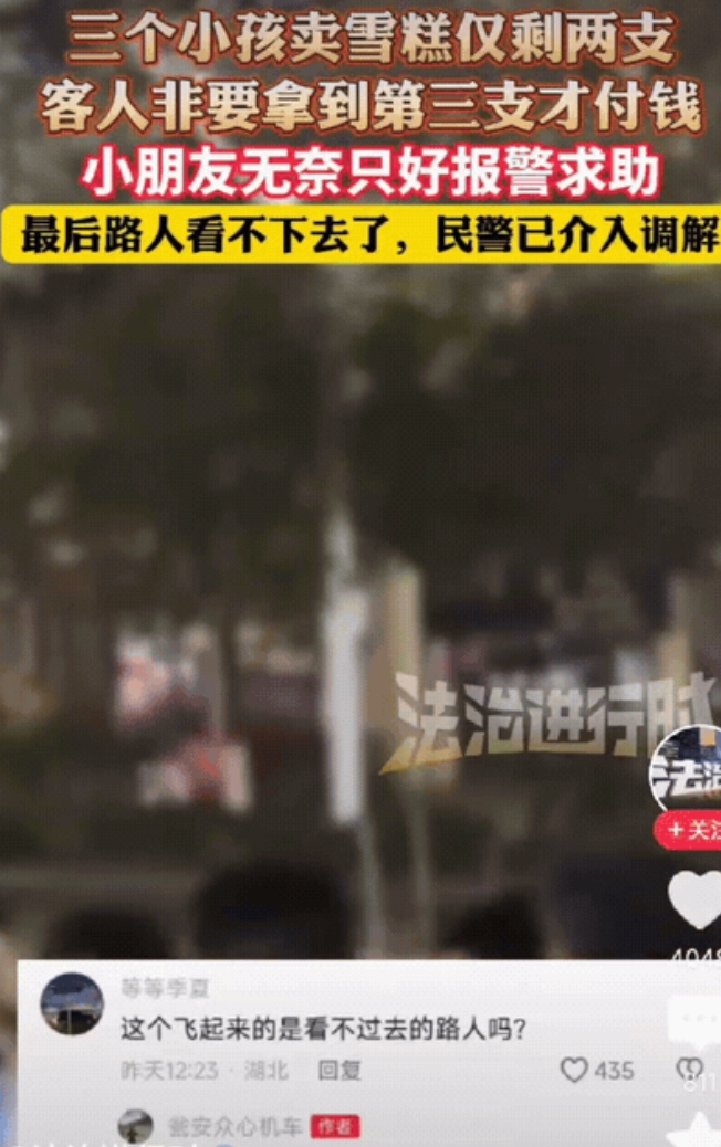 “欺负小孩算什么本事!”贵州,3个小孩卖雪糕仅剩两支,客人吃完两根,非要吃第三根才肯付钱,小朋友无奈报警,路人都看不下去了,这一家人看到民警还是不付钱,最后烧烤摊老板娘看不下去,自己掏钱付了,网友:丢人现眼! “好不容易卖最后两根他还不给钱,看来要亏本了!” 三个孩子站在贵州的街头,手里攥着仅剩的两根雪糕,望着眼前吃完雪糕却拒不付钱的男子,眼中满是委屈和无助,这一幕发生在7月,孩子们本想通过卖雪糕赚点零花钱,却遭遇了令人心寒的“霸王餐”。 事情的起因简单却令人气愤,三个孩子在路边摆摊卖雪糕,冰箱里只剩下最后两根,一名男子明知如此,却执意要买第三根雪糕,声称吃完才付钱,孩子们出于信任,将雪糕给了他,没想到男子吃完后不仅拒绝付款,还理直气壮地要求再拿一根,孩子们反复解释雪糕已经卖完,男子却毫不在意,甚至态度蛮横,无奈之下,孩子们只好选择报警求助。 民警赶到现场后试图调解此事,但该男子依然拒绝付钱,甚至态度更加嚣张,周围的路人都看不下去了,纷纷指责男子的行为,认为他欺负小孩毫无底线。 就在事情陷入僵局时,附近烧烤摊的老板娘挺身而出,主动掏钱为男子付了雪糕的钱,替孩子们解了围,老板娘的行为不仅感动了在场的所有人,也让网友们纷纷点赞,称赞她的善良和正义感。 这一事件迅速在网络上引发了热议,许多网友对男子的行为表示强烈谴责,认为欺负小孩不仅丢人,更是毫无道德底线,有网友评论道:“欺负小孩算什么本事!有本事去欺负大人啊!” 还有人直言:“这种人真是丢人现眼,连孩子的钱都要骗!”另一些网友则对老板娘的行为表示赞赏,认为她的举动不仅帮助了孩子们,也传递了社会的正能量,当然也有人表示:“老板娘的做法太暖心了,这才是我们应该学习的榜样!” 总之,贵州的这起事件不仅让我们看到了人性的丑陋,也让我们感受到了社会的温暖,男子的行为固然令人气愤,但老板娘的善良和路人的正义感则让我们对人性依然充满希望,希望这样的事件能引起更多人的反思,让我们的社会变得更加美好。 对此你怎么看?欢迎大家在评论区留言讨论。