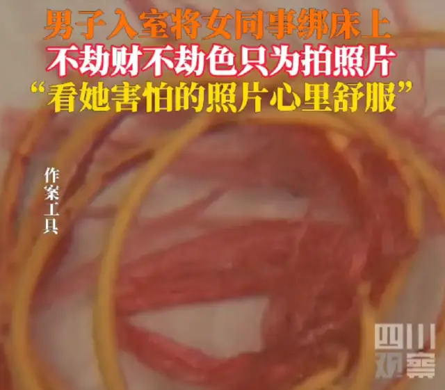 正当她不知道该怎么办的时候,陈某突然就开始发神经,取出自己的作案工具——几根绳子,还有胶带。只见他把女同事给按在床上,然后开始给她五花大绑绑到床上去,接着撕开胶带封住她的嘴巴。