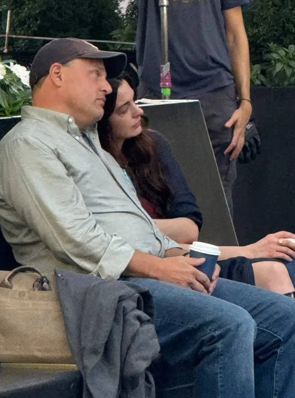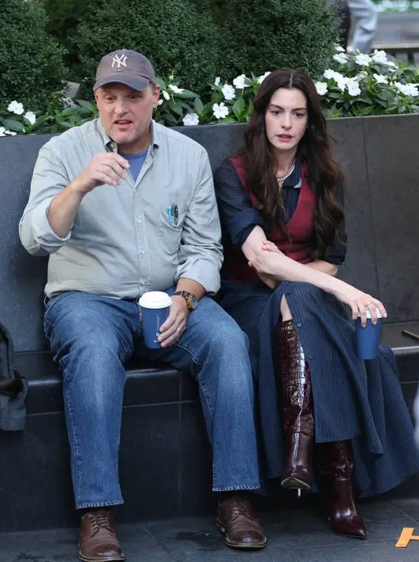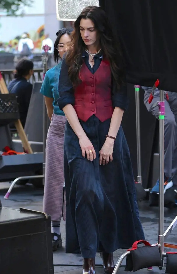 安妮海瑟薇电影片场路透释出,酒红马甲配长裙,复古时尚超有气质。