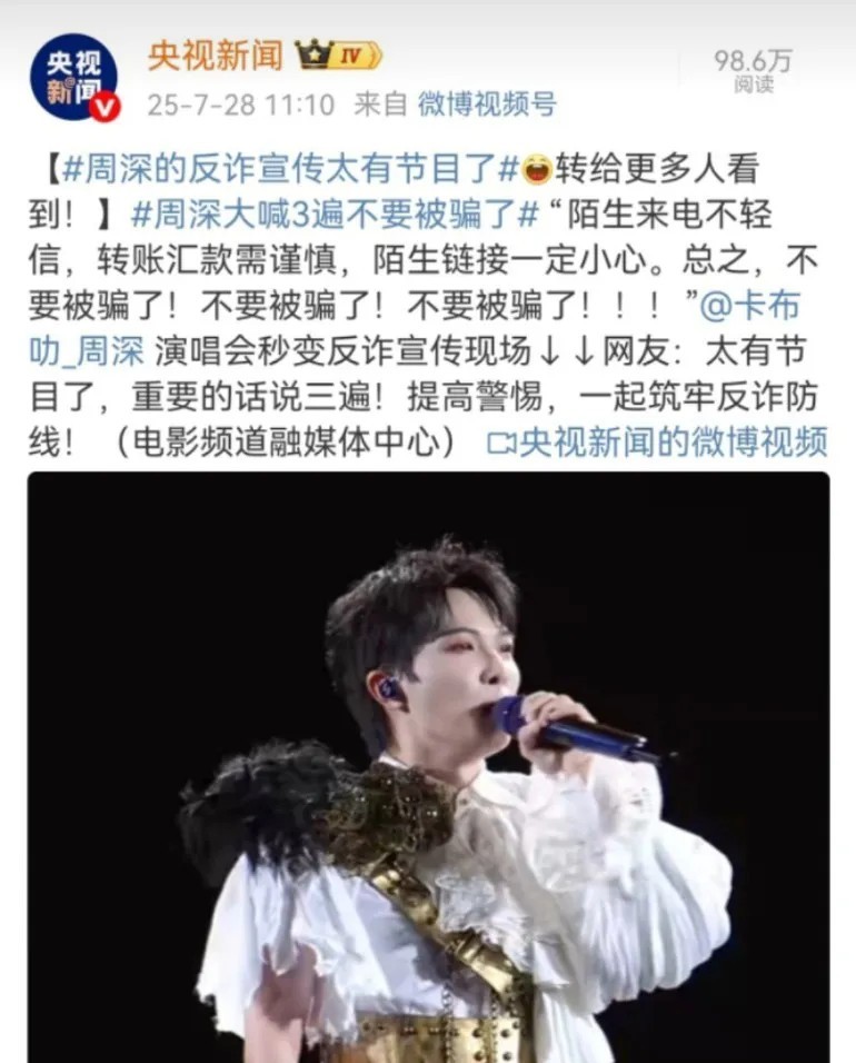 y又又双叒被周深演唱会的排面惊到了!这次竟然又被大官媒报道,这待遇,说是“演唱会顶流”都不为过! 回顾一下,周深被3大官媒齐报道的时刻,桩桩件件都堪称乐坛高光。纽约演唱会后的联合国专访,让世界听见华语音乐的力量;太原、青岛专列,实力诠释什么叫“偶像与歌迷的双向奔赴”,还拉动了文旅经济;西安反诈宣传,用明星影响力助力正能量传播。 日常里,官媒对周深的关注也没断过。有演出时,发演出精彩瞬间,像《考公记》《好风起》;没演出时,就用他的歌剪辑风景视频。他的演唱会,关注度直逼卫视舞台,每次都能掀起全民讨论热潮。 不得不说,周深用实力和魅力,让自己的每一次舞台都成为焦点,被官媒偏爱,他当之无愧!