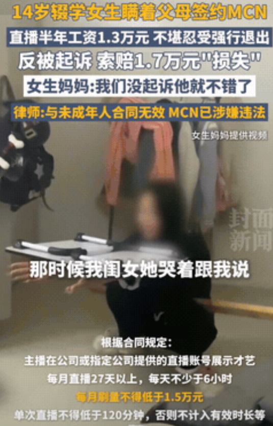 “必须严惩!”山东德州,14岁辍学小姑娘瞒着父母签下直播合同,发烧时却遭老板强行闯入房间,竟然捏鼻灌药逼她上班!更让人气愤的是,姑娘辛苦干了半年,工资仅有1.3万元!当她不堪受辱,想要退出,公司反倒将她告上了法庭,要求索赔1.7万元损失!女生妈妈:“我们没起诉他就不错了!” 据封面新闻7月28日报道:山东德州有个叫小云的小姑娘,才14岁,去年秋天没跟爸妈说一声,自己跟济南一家搞直播的公司签了合同。 这孩子半年里播得够辛苦,一个月播27天,天天至少熬6个钟头,统共就拿到13000块钱工资。 最让人揪心的是有一次,小云感冒发烧难受得很,那公司的男老板居然直接闯进她和几个未成年女孩合租的房子里,捏着她鼻子硬灌退烧药,催她赶紧继续上班! 这还不算,要是没完成公司定的那些任务,还得被罚,比如在同事面前蹲着唱歌,或者聚餐时被老板抓着腿倒提起来,孩子哪受得了这个? 后来实在扛不住,小云就不干了,谁成想,她不干反倒惹上事儿了。 那家公司把她告上法庭,张口就要她赔16941块钱,说是小云害得公司账号被封,平台把钱扣了,他们损失巨大。 小云妈妈一听气坏了:“他们还有脸告我们?我们不告他就不错了!”记者找了好几次这家公司想问明白,可人家根本不理。 再翻翻那份合同,里头条款吓死人:孩子要是敢自己接活或者动佣金,就得赔公司至少50万!关键签合同的时候小云才14岁,就是个孩子,连爸妈都不知情,合同上居然敢写她“有完全行为能力”。 这事儿一出来,网上都炸了锅。不少网友气得不行:“14岁的孩子懂啥叫合同?背着爹妈签的东西能算数?该进去的是那黑心老板!” 还有网友怒斥:“发烧硬灌药,还闯女娃宿舍,这公司干的还是人事吗?犯法了!” 律师说:跟14岁小孩签这种合同,本身就是白签,法律根本不认!国家的法律都摆在那儿,清清楚楚保护未成年孩子! 这家公司又是用童工,又是逼着孩子玩命干活,还克扣工钱,条条都是硬伤,一罚一个准儿,绝对跑不了,它还有理恶人先告状了? 大家伙说说看,这种欺负孩子的公司,是不是得好好管管?在评论区谈谈您的看法。