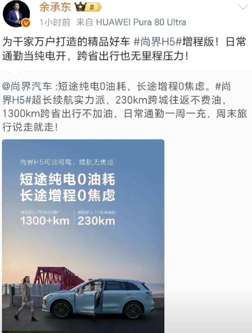 继回复某帝评测不予置评之后,余承东公布尚界H5增程版,两个“0”破防了!短途纯电0油耗,长途增程0焦虑。日常通勤当纯电开,0油耗,230km跨城往返不费油,跨省出行0焦虑!1300km跨省出行无里程压力,日常通勤一周一充,周末旅行说走就走!