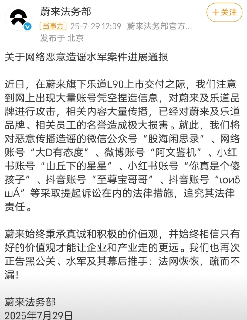蔚来被友商黑惨了?谁干的? 今天蔚来发布通告称要起诉一大波造谣传谣的博主,结果通