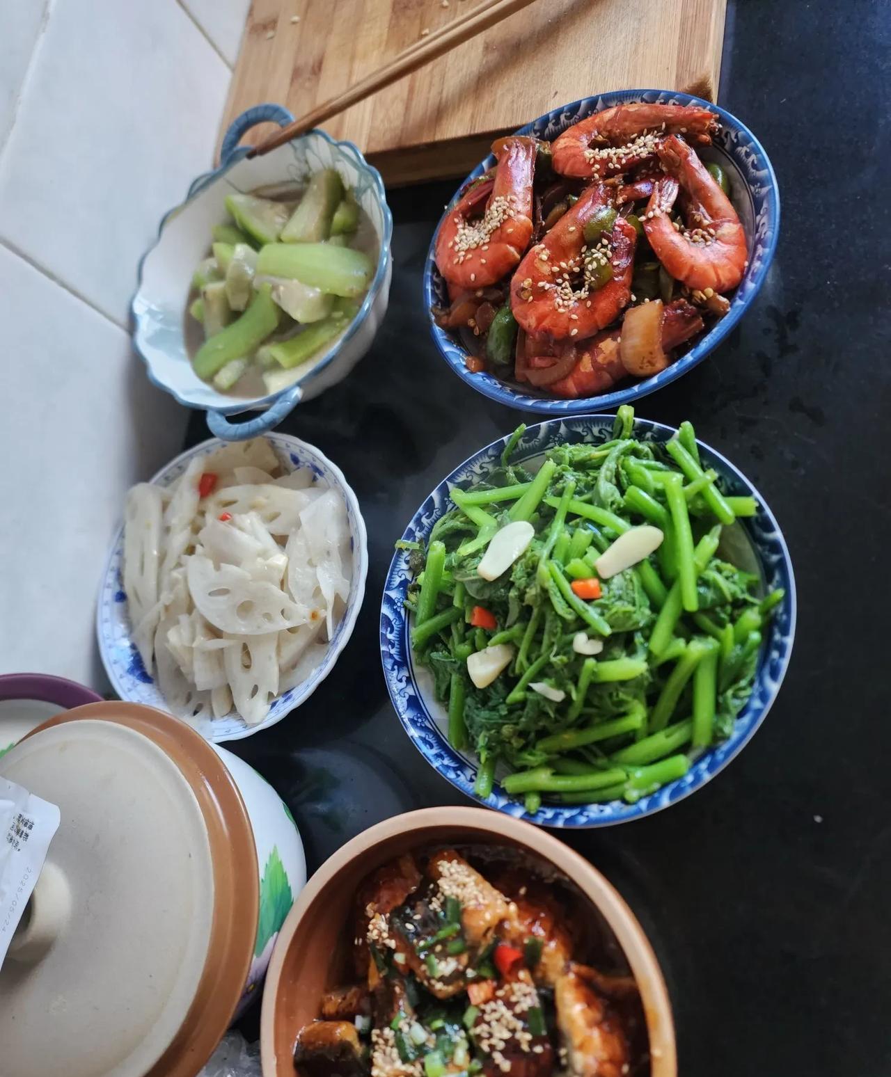 7.29祝氏晚餐:糖醋鳗鱼,啤酒醉虾.滑炒藕片,爆炒南瓜尖,清炒丝瓜,排骨冬瓜汤