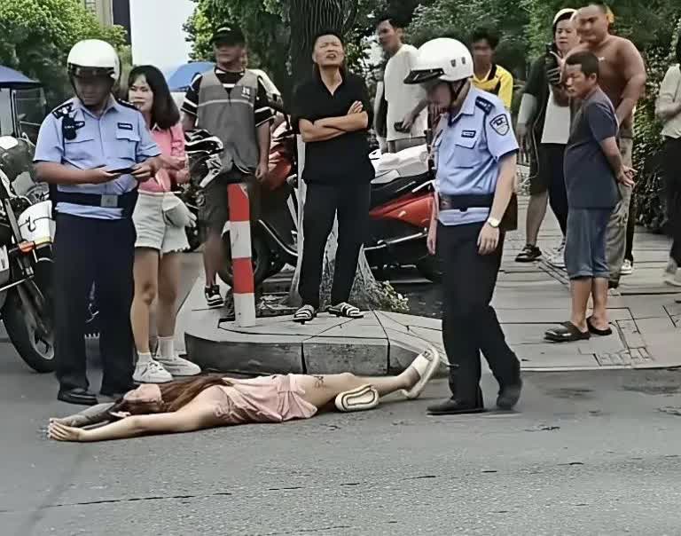 一女子在路对面开始爬,到中间然后爬到路边就闭着眼睛,躺了下来,一动不动的,有一个胳膊是黑的。 路人见状报了警,警察赶到后,女子依然一动不动地,引起众人围观,不知女子是生病了,还是怎么了。