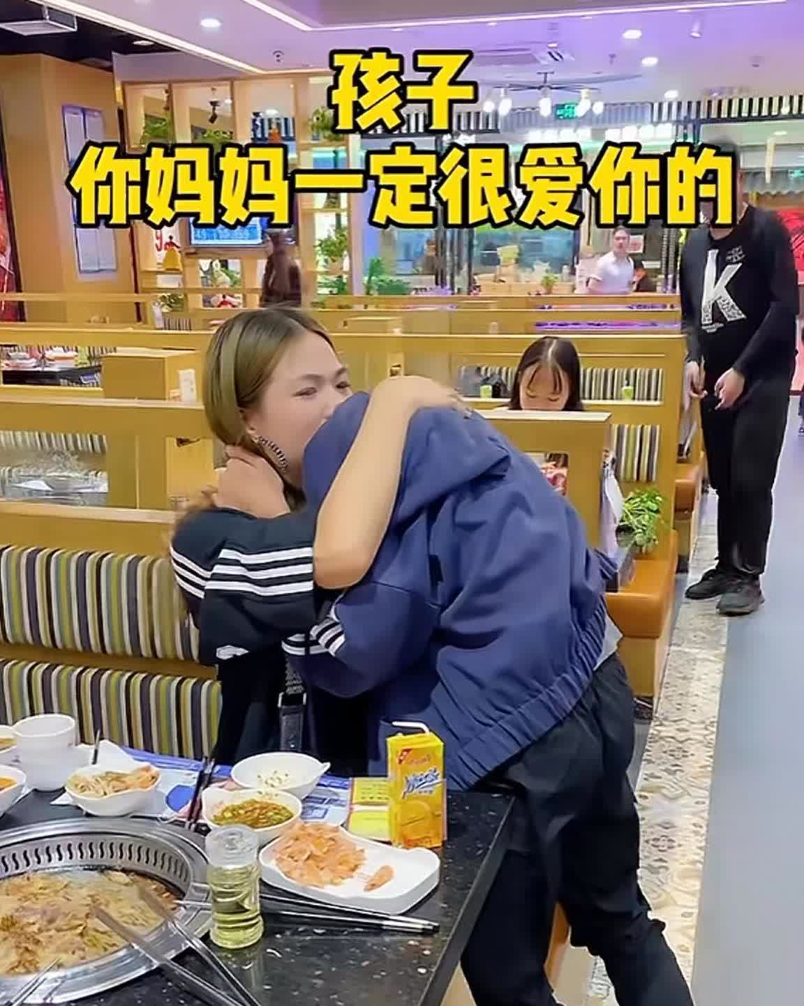 “潸然泪下!”广东茂名,一小男孩在餐厅就餐时,发现隔壁桌的女子背影像妈妈,他借上洗手间,特别经过女子身边,回头一望,瞬间眼噙泪水,“阿姨,你跟我妈妈很像,能给我一个拥抱么?”女子给了他一个温暖的拥抱,轻拍男孩背部安抚! 在广东茂名的一家小餐馆里,有个十岁的小男孩小明,因为看到一个背影跟他妈妈有点像,就和一位不认识的阿姨有了段温馨的小故事。那一刻,思念、感情和温柔都混在了一起,让餐馆里的每个人都觉得心里暖暖的。 那天晚上,小明的爸爸张先生带着他在餐馆吃饭。小明坐在椅子上,眼睛却被旁边桌子上一个穿红衣服阿姨的背影给吸引住了。那背影、头发颜色,还有坐姿,都让他觉得特别像妈妈。他看着看着,眼眶就湿了。他想起三年前离开的妈妈,心里好难过。 小明找了个上厕所的借口,悄悄地走到阿姨旁边。他鼓起勇气,转过头看了看阿姨的脸,眼泪一下子就出来了。“阿姨,你看起来好像我妈妈,能给我抱一下吗?”他声音有点小,但听起来很真诚。女的愣了一下,然后轻轻地张开胳膊,把小明搂进了怀里。小明再也忍不住了,眼泪掉了下来。他使劲抱着她,就像又找到了那份失去的妈妈的温暖。女的轻轻地拍着他的背,小声地安慰他,温柔得就像妈妈一样。 张先生看到了这一幕,眼里也泛起了泪光,走过来,他们三个人紧紧地抱在了一起。就在那一刻,妈妈的感觉好像又回来了,温暖了两个一直想念她的心。 一个不认识的人的拥抱,把想念的痛给抚平了。那天晚上,餐馆里多了一份让人心里暖暖的感动,也让我们再次相信,爱,一直都在。
