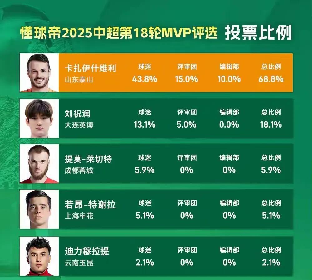 瓦科当选懂球帝评选的中超第18轮MVP,不得不说帽子戏法的表现实在是太亮眼了,基本上每轮联赛拿了帽子戏法的球员就能锁定当轮的MVP,虽然踢得是梅州这样的保级球队,但即便如此克雷桑也多次错失进球良机,反而是瓦科把握住了机会,希望接下来的比赛瓦科能够进更多的球,目前瓦科以11粒进球位居射手榜第二位,如果瓦科保持目前的进球效率,这赛季还是有很大的可能拿一个联赛金靴的,虽然下赛季瓦科很可能离开泰山队,但是带着金靴离开泰山队也是一件不错的事!