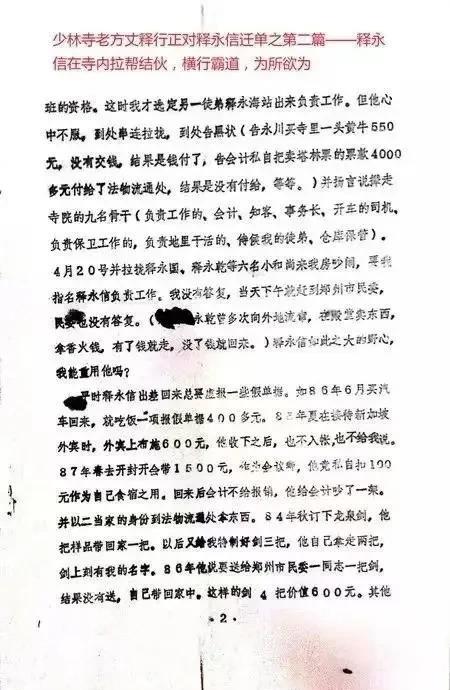 1987年5月,少林寺第二十九代方丈释行正写信控诉徒弟释永信存在严重经济问题,不