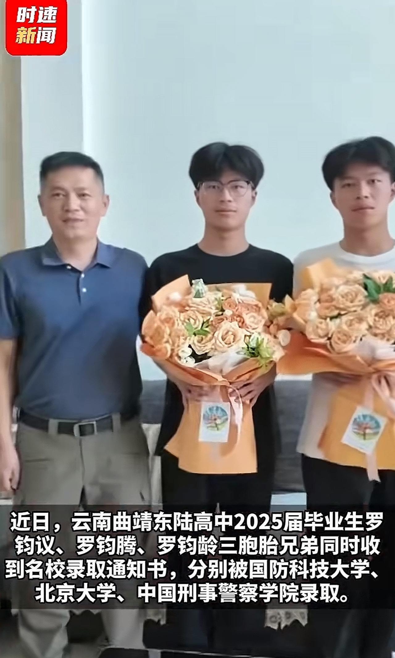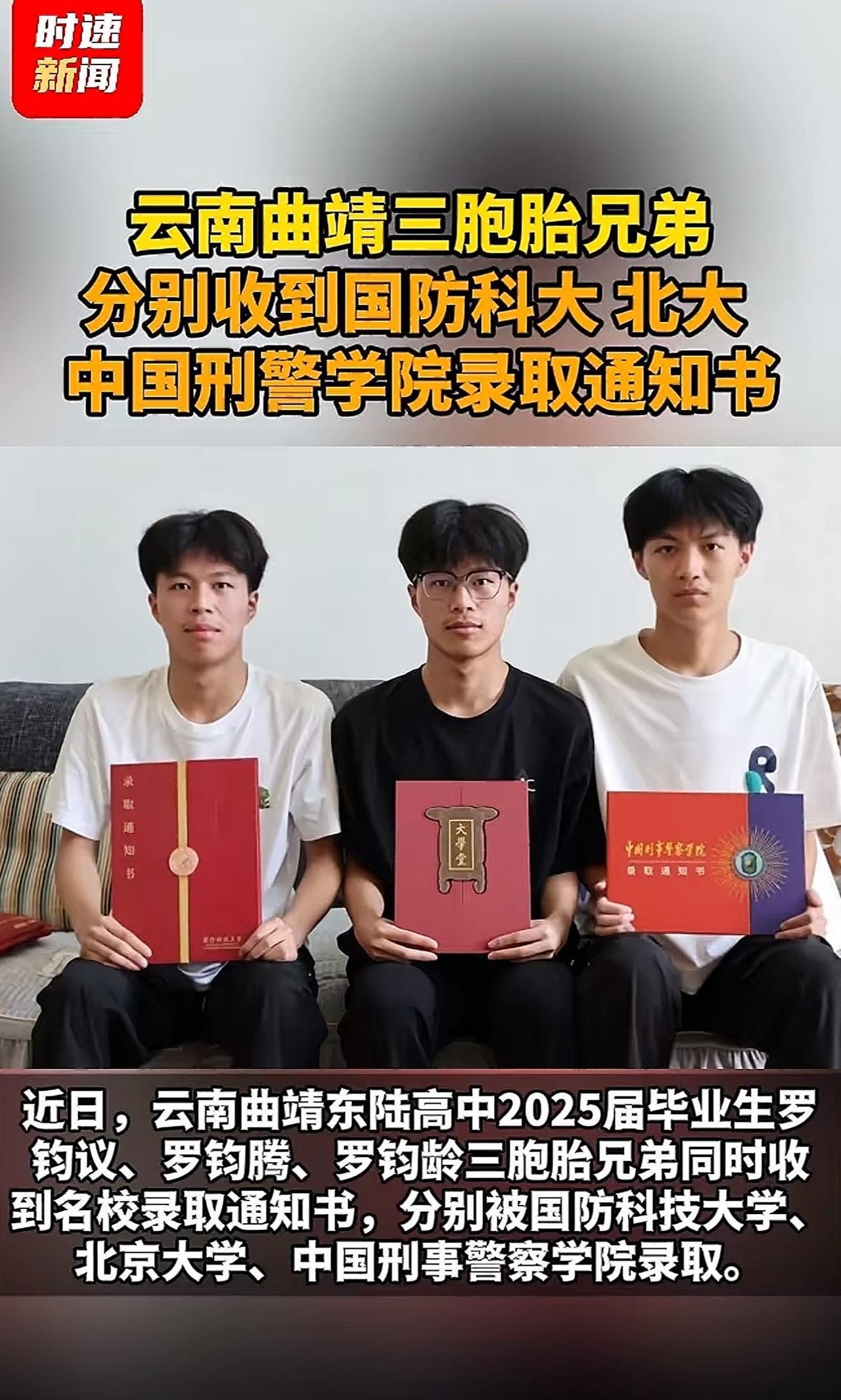 #MCN双量进阶计划#“这祖坟都要燃烧起来了!”云南曲靖市,一高中三胞胎兄弟同时考入名校,其中,老大考上国防科技大学,老二考上北京大学,老三考上中国刑事警察学院,引发众多网友关注和热议。 对于这三胞胎兄弟同时考上顶尖名校,不少网友纷纷羡慕道,“文状元,武状元,刑部尚书,一下集齐了,这不是祖坟冒青烟,这是祖坟燃起来了!” 这三胞胎兄弟同时考上顶尖名校,周少不得不说确实让人打心底里佩服,真是给家里长脸了!用老祖宗话来说,这就是祖坟冒青烟了。 老大去国防科大,保家卫国;老二进北大,钻研学问;老三上刑警学院,守护平安。三个孩子都进了顶尖院校,选的路,正好对应了祖国需要的不同领域,这背后肯定不只是运气。 很多人羡慕“祖坟冒青烟”,其实恰恰反映出,其家庭教育的重要性,其父母背后估计花了不少心思,既要平衡三个孩子的需求,又要培养他们的自律性。这没有一套特别扎实的方法,不然很难做到个个拔尖。 都说“寒门出贵子”,但现在更能看出,不管家境如何,孩子的成长里,父母的耐心陪伴和价值观传递,往往比物质条件更重要。这对双胞胎兄弟的故事,值得更多家长关注,特别是其学习方法以及父母的家庭教育。 对于云南这双胞胎兄弟同时考取顶尖名校,大家怎么看呢?#寻美三湘# #长沙新朋友#
