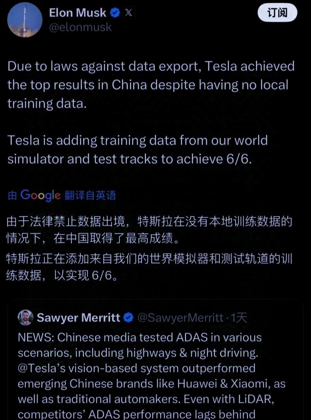 D车帝这个辅助驾驶结果一出来,蔚小理没急,比亚迪也没急,小米更没急! 第三,长城魏牌蓝山 这个排行榜一出,车圈直接炸锅,有人认为这个测试是假的,央视也是无奈,把联合二字给删除了,真是太狠了。不过对于这个结果,最淡定的车企是蔚小理,比亚迪以及小米等车企,因为买理想的人,是为了大空间和舒适,买小鹏的,是为了性价比,买蔚来的,是为了支持原创,买比亚迪的,也是为了性价比,买小米的,是为了颜值,说白了就是买这些品牌的消费者,压根就没有把辅助驾驶当成购车因素。这次测试最大的赢家当然是特斯拉,因为网上都说FSD不太行,现在实测结果一出,确实是一个大反转,马斯克也是高兴的连夜转发这一测试的成绩。 但说实话,我觉得这个测试没办法测出各大品牌辅助驾驶的性能,说白了还得看实际表现,目前为止主动分享辅助驾驶行车记录仪视频最多的是问界车主,比友商表现好太多,所以说我依旧认为华为ADS在技术和体验上是最好的,因此如果买车真是为了辅助驾驶,我肯定首选鸿蒙智行系列。对此大家有什么看法呢。
