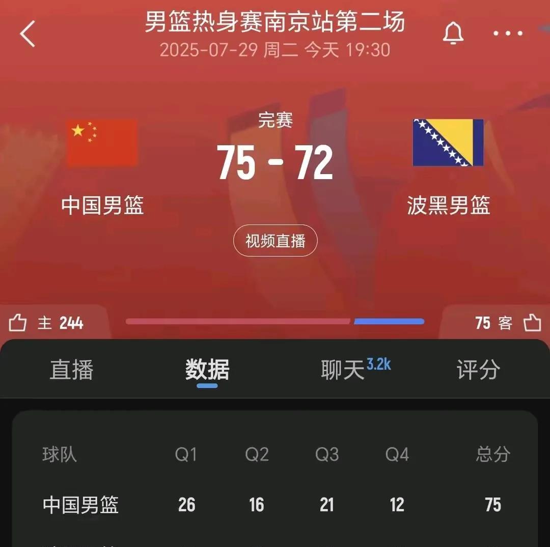 男篮75-72再胜波黑,球员评分:胡金秋100分、徐杰98分、雷蒙98分