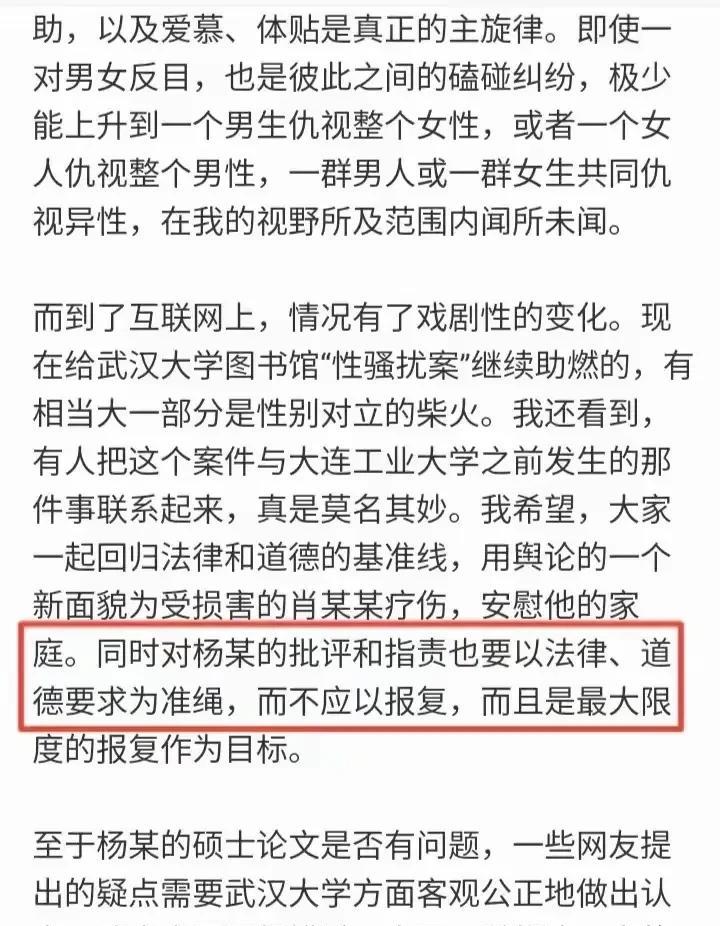 不出意外!对于武大杨某媛的事胡锡进又站在了全国网民的对立面! 近日,对于武七大杨某媛的所作所为,全国人民一片声讨,武大的校友们心急如焚,生怕母校继续干糊涂事,也积极地发声要求严肃处理杨某媛。商务部研究院的梅新育都站出来发声,要求开除并取消她的学籍,支持肖同学起诉。 现在杨某媛又被扒出论文造假,面临着被香港浸会大学开除甚至是被武大取消毕业证书的困境。 此时此刻,毫不意外地胡锡进也发文了,而且是毫不意外地站在了全国绝大多数网友的对立面! 老胡也承认,肖某某受到了极大的伤害,甚至因为伤害出现了精神问题进了精神卫生医院。然而,老胡更倾向于认为杨某也受到了激烈的网暴,呼吁全国网民要宽容,不应以报复作为目标! 没想到老胡的法律意识居然如此淡薄,竟然认为网友们的本意是要报复! 在我看来,这哪里是报复,这是要追究她的法律责任,让她为自己做过的知法犯法,践踏法律底线的行为负法律责任,承担法律后果,是还法律尊严,而绝对不是老胡所说的制造什么“男女对立”。 因为即便是女性网友,如果了解了她的所作所为,也绝对不会支持她的胡作非为。她已经被女性网友抛弃了,要求追究她的法律责任,怎么就叫制造“男女对立”了呢? 不得不说,老胡这“和稀泥”的本事又见长了,只不过完全没说到点子上! 真怀疑他的用心究竟是什么? 怕不是别有……吧!?