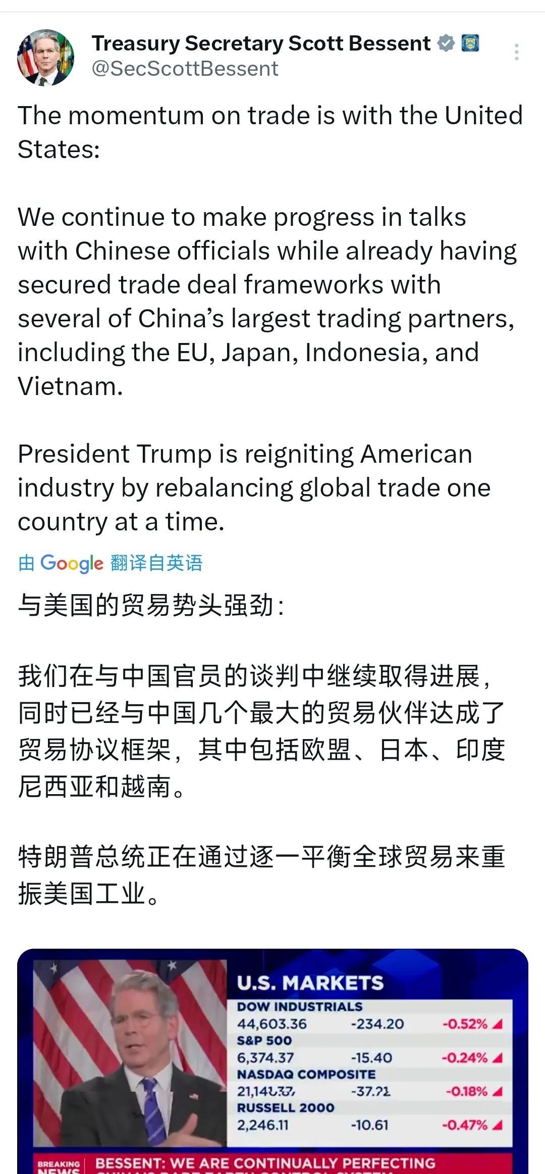 中美结束在瑞典的谈判后,美国财长贝森特意味深长地写道:“贸易的势头是与美国:我们继续在与中国官员的谈判中取得进展,同时已经与欧盟、日本、印度尼西亚和越南等中国几个最大的贸易伙伴建立了贸易协定框架。特朗普总统正在重新点燃美国工业,一个国家一个国家地平衡全球贸易。” [机智]评几句:贝森特此举是司马昭之心路人皆知。美国妄图拉拢欧盟、日本、印尼、越南等围堵中国,搞孤立那一套。这是贝森特的传统认知,以为如此就能迫使中国让步,为美国经济谋利、减赤字、促产业。但是中国不会任其摆布,今时不同往日,中国有实力有底气应对。从奥巴马到特朗普1.0,再到拜登,美国的对华经济围堵与遏制,并未实现其战略图谋。现在是特朗普2.0,美国依然不会得逞。