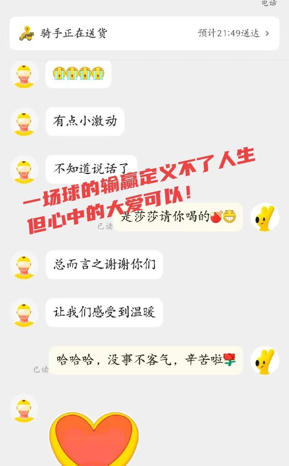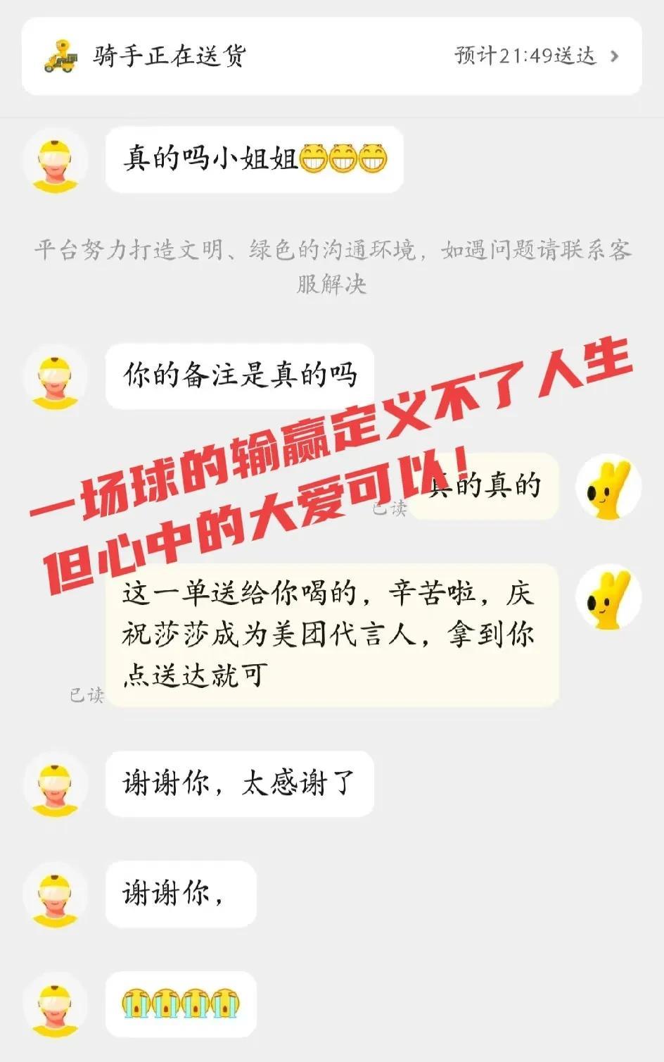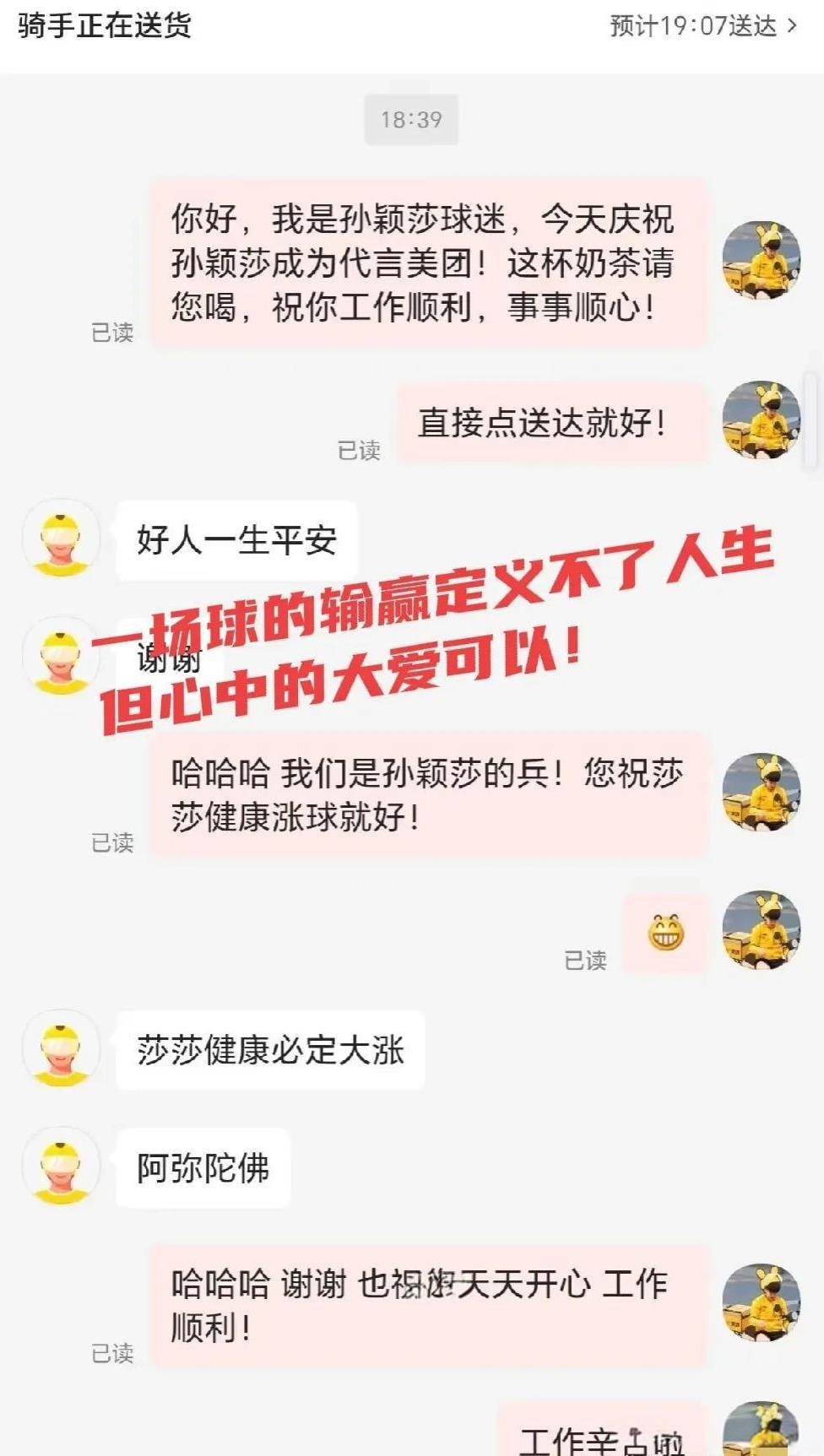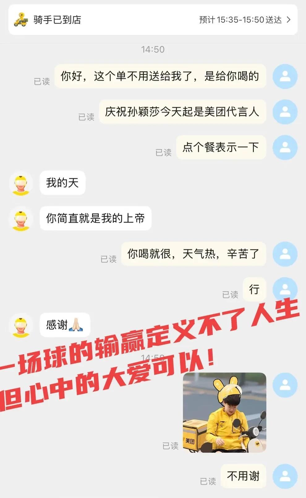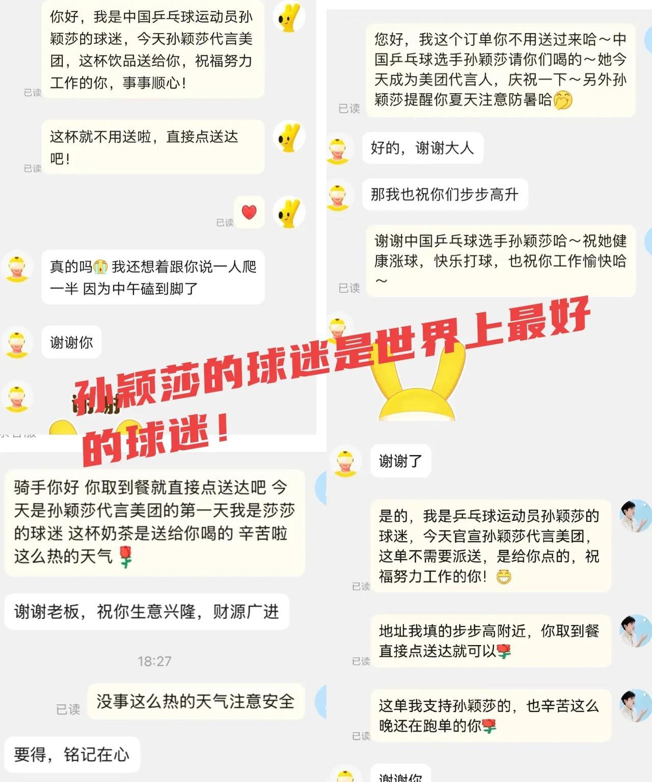 一场输赢定义不了人生,但心中的大爱可以啊![心][心] 当莎莎能蹲下来为平凡生活撑伞! 当莎莎的球迷能正向的回馈社会! 莎莎的"赛场"就已经赢了! 莎莎把我们对她商务的支持,她转化成了对社会的公益,正能量的回馈给社会,她不恋财不恋名,她真的很善良,很明亮! 在莎莎被官宣为美团代言人的第一天,多少外卖小哥被莎莎的球迷感动? 在生活中球迷的这个举动可能只是小小的一杯饮料,一餐饭,但是现在正值暑假,可能在外卖小哥里面除了有很多为生活奔波的人,也有很多正在打暑假工的兼职学生。 可能这一个小小的举动,这一点点的温暖送给他们,在他们心里面也许会发生质的变化,他们会觉得在艰苦奋斗的路上感受到这社会给他们的温暖,他们对生活对人生会更加积极,会更加向阳! 大家一起加油哇,我们都要像莎莎一样,向阳生长,积极向上,开心过好每一天,我们一定会越来越好! 莎莎,健康涨球!所向披靡!快乐乒乓!![心][心]