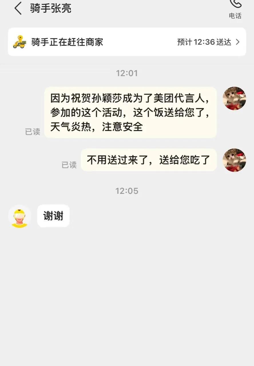 官方都发话了, 可见莎莎这代言的重要性, 估计今天好多商家跟骑手都笑开了花, 泼天的富贵终于轮到了他们, 莎莎永远值得信赖。 莎莎的球迷也跟莎莎一样温暖, 好多球迷为了支持莎莎, 特意点了外卖, 转而又送给骑手吃, 这骑手不得笑死, 不用送, 还有免费的午餐, 而商家也赚到了钱!