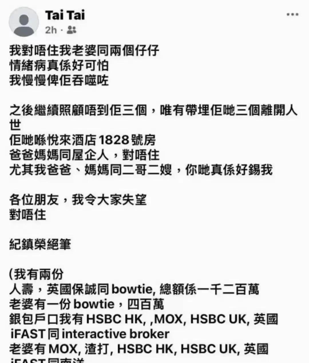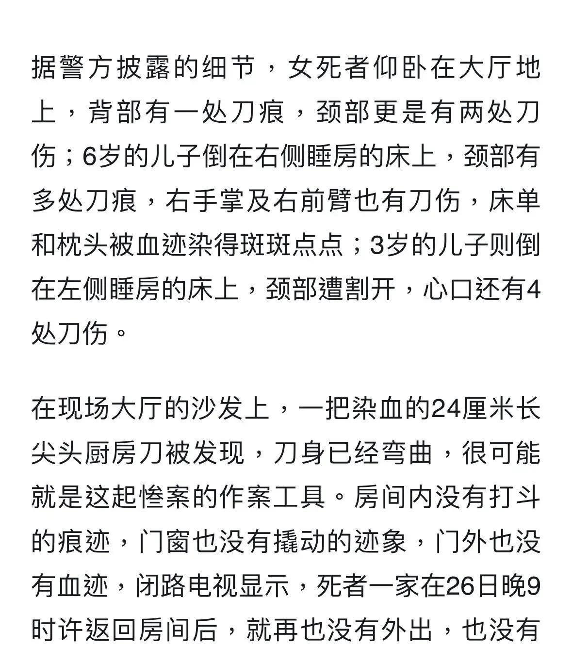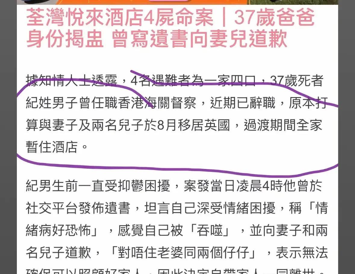 太可惜了,一家四口,男的39岁,有体面的工作,在香港海关做督察;女的是全职太太,除了带好2个孩子以外,业余时间还在努力做海外账号的自媒体,做得风生水起,可以看出女主人是个积极向上又顾家的人。 两人自高中相识到步入婚姻殿堂,日子过得一直很幸福美满。婚后育有2个孩子,大的6岁,小的3岁。一家人已打算移民到英国,5月至7月底,这3个月暂住在酒店,作为移民的过渡期。 谁承想,男子因为重症抑郁,一直有自杀的倾向,在准备出国的前几天,坠楼身亡。在他最后的发文中透露了比较重要的一点:自己离开了,担心孩子和妻子无人照顾,所以也把他们带走了。 一家四口,以如此惨烈的方式离去,让人唏嘘不已。 据消息透露,他们租住的酒店是2居室,夫妻俩和两个孩子分别住在两个房间内,当时房间的门是反锁的,窗户也是锁死的。 女子颈部和背部有两处刀伤,躺在大厅的地上。 6岁的儿子倒在床上,颈部多处刀痕,右手掌和右前臂也有刀伤。 3岁的儿子颈部遭割开,心口有4处刀伤。 从这些伤口来看,母子三人在遇害前,做过一些挣扎,看到男子的刀伸过来,都曾下意识地用手去挡刀。女子背部有伤,也说明了这一点,可能是她准备逃跑,奈何根本跑不掉。 母子三人的体力都不敌男子,而且男子一心要带他们走,又早早地把门窗锁死,基本上求救无门。 可以想象得出,女子在死前有多么痛心,两个年幼的儿子,最大的才6岁,最小的才3岁啊。怎么忍心剥夺他们的生命权?即便是孩子最亲的亲人又如何? 从这里也可以看出,男子做傻事前没有任何的征兆,女子也没有发现他有任何的异常,否则她一定会提前带2个孩子,藏到安全的地方,并找人带男子看病。 太可惜了。一个人生病,害死了全家,她们的求生欲望很强啊。女子一边带娃一边做自媒体就足以说明,她很爱这个家,很爱这两个孩子和丈夫。 这名男子抑郁症已有半年,身边的朋友也知道,也曾陪他到当地的一家私人诊所看病,出事的几天前,一家人还和朋友们一起吃了饭,并没有任何的异常。 可见,这病隐藏性很大,表面上看着跟正常人一样,其实,根本不正常了。也正因为如此,才让人防不胜防啊。 人在抑郁的时候,一切也非他们内心真实所愿了。整个人,仿佛被魔鬼所控制。 痛心,愿此类悲剧不再发生。