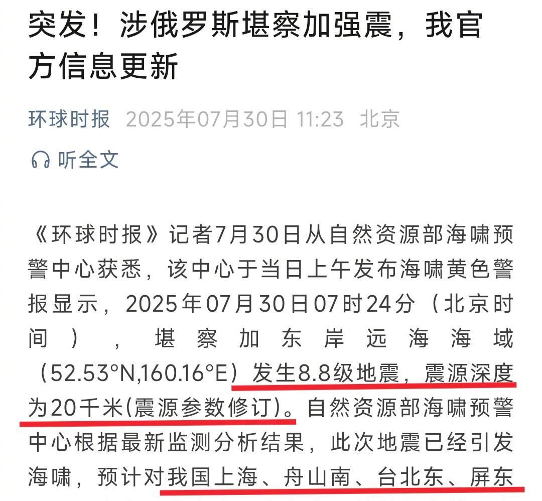 俄罗斯远东发生8.8级地震,俄核潜艇基地恐受影响;日本17个地区发布海啸预警,中国上海可能也要受灾 当地时间30日晨,俄罗斯远东的堪察加半岛附近海域,于1小时内数度发生强震,震级最高达8.8级(最新更新的数据),烈度极高。从网上流传的视频能看出,这次地震的破坏力相当大,建筑物摇晃得很剧烈,人们尖叫着避难,有幼儿园的墙体出现坍塌,沿海的建筑物被海啸冲垮,部分木质房屋甚至直接连着底座被冲跑,场面看起来相当可怕。 而俄军位于远东最大的核潜艇基地——维柳钦斯克基地距震中也不太远。以目前的情况看,估计该基地也会遭受一定程度的损失。就是不知道这座几年前刚进行过现代化升级的基地,在设计施工时有没有考虑到会遭遇这个震级的地震,驻扎在其中的“北风之神”级、“亚森”级等各类潜艇,又会不会因地震而发生损伤。 另外,由于地震发生在太平洋海域,堪察加半岛当地、日本由北向南的17个沿海地区,甚至是阿拉斯加和夏威夷群岛,都发布了海啸预警#日本多地发布海啸预警#,初步预计,部分地区可能会出现最高3米的海浪。#日本部分地区或出现3米海啸#石破茂也在喊话日本沿海民众,立刻远离危险地带,前往高处避难。目前的最新消息是,福岛核电站已经紧急疏散了员工,核污染水排海工作也已暂停,至于后续何时恢复,仍处于待定状态。#福岛第一核电站暂停核污染水排海# 到了北京时间上午9点多,首波海啸已经抵达日本北海道沿海,浪高不算太高,但后续不排除发生更严重海啸的可能。中国驻日使领事馆也发布了多份紧急通知,提醒在日同胞远离危险地带,以确保安全。 同时,我国也发布了海啸预警,预计上海、台岛等多地,可能也要因海啸而受灾。#MCN双量进阶计划#