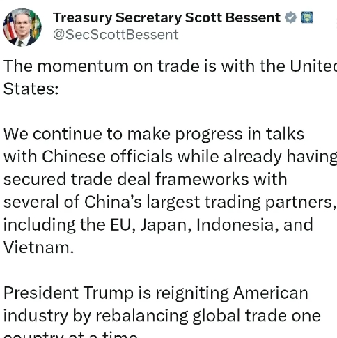 昨天,贝森特向特朗普汇报后,意犹未尽的他写道:“中美谈判取得进展,同时,我们已与中国主要的贸易伙伴达成了贸易协议框架,其中包括欧盟、日本、印尼和越南,特朗普总统正在通过逐一平衡全球贸易来重振美工业。”
