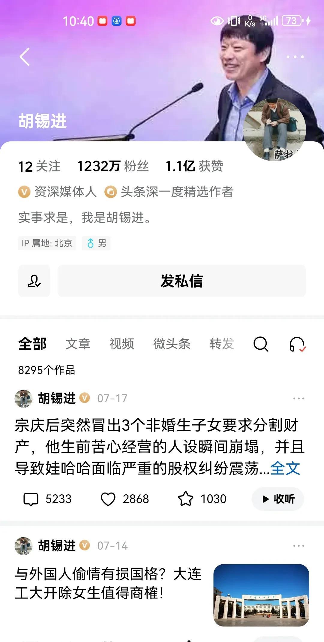 但老虎这几个号的状态也呈现了非常大的差异,这就奇怪了。一般这样的大咖都有工作室,有助理专门打理,基本上几个号内容都是同步的。 但是大伙请看,老胡拥有两千多万粉丝的微博号和拥有六百多万粉丝的百家号,发布内容截然不同。 老胡也是网络一大现象,烦他的人很多,吹捧他的也不少。这或许跟他著名的骑墙风格有关。 老胡要是真封了,互联网会安静许多,这是好事还是坏事呢?