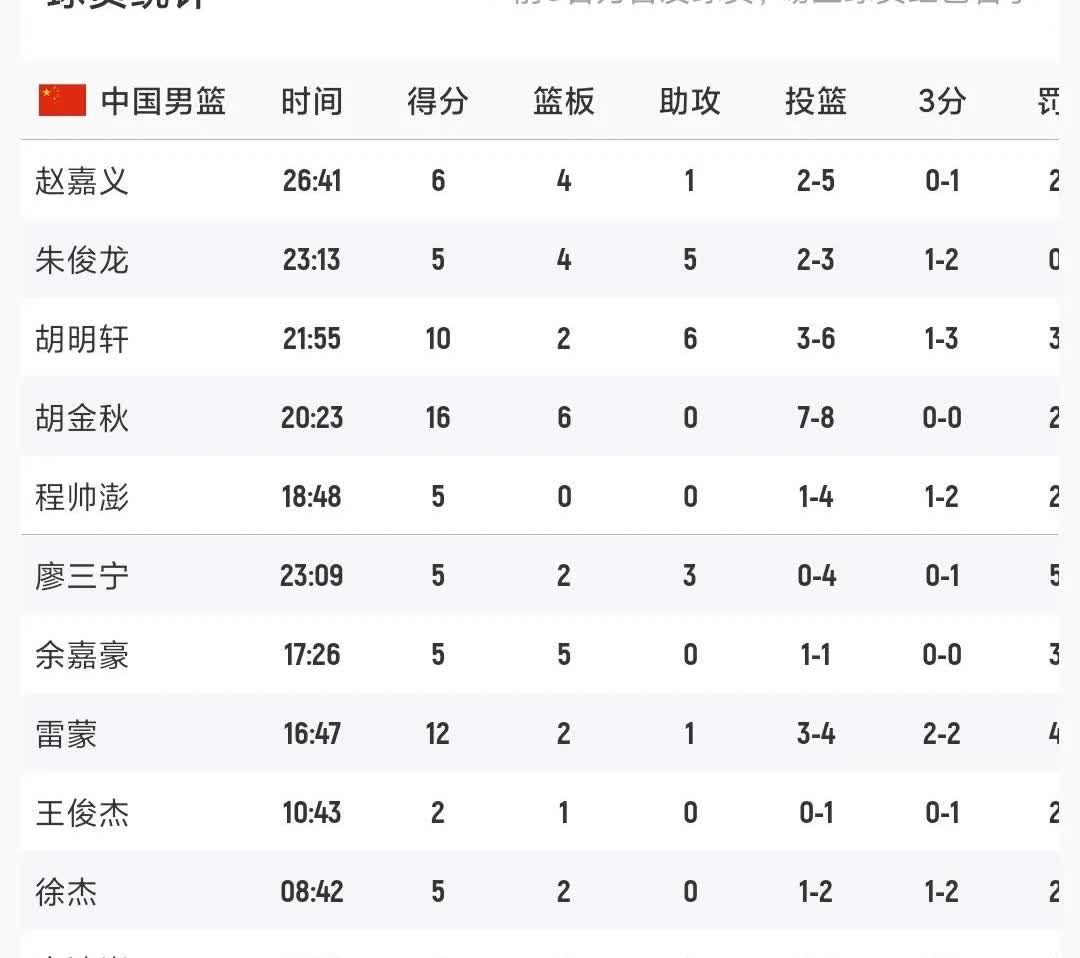其实决战时刻真的可以让徐杰来组织! 今晚的热身赛,没想到中国男篮会赢得如此艰难,最终仅仅以75:72的比分战胜对手,要知道上一场比赛面对同个对手,中国队可是兵不血刃的赢了对手20分啊! 最后时刻真应该让徐杰来打关键节点,因为中国队在决战时刻的失误实在是太离谱了,控球后卫无论是廖三宁还是胡明轩都不行,这个时候也许徐杰是最好的选择。 本场比赛看似徐杰在后三节都有安排出场,但是全场他仅仅出场的总时间也只不过是8分42秒,仅仅出手两次,得到5分2篮板。 本场比赛过后,最终12名球员应该很快会有一个结果,但是徐杰能否进入最终12人大名单真的很悬!