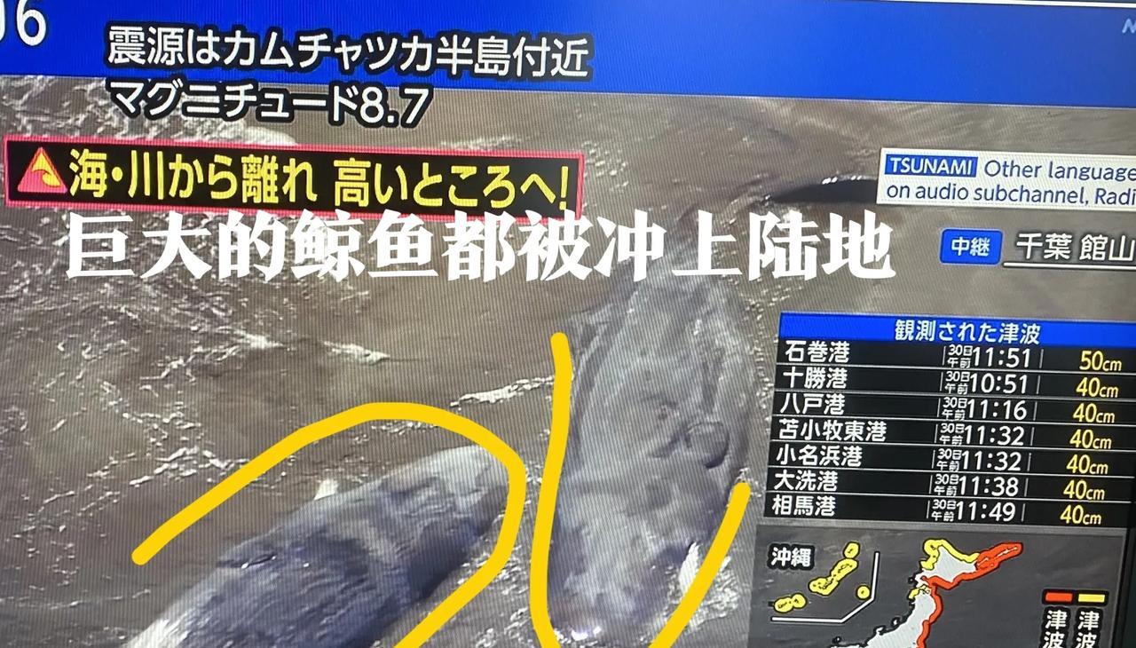 今天早上海底大地震引发的第一波海啸已经到港!俄罗斯堪察加半岛和日本东海岸已经遭到海啸的冲击! 一米高的海啸可不单单是一米高的海浪那么简单——里面卷入了大量的金属、砂石、树木甚至各类残骸,相当于一块流动的固体墙。据报道,已经有四只鲸鱼被冲上日本的海岸。 目前日本迎接的是60厘米到3米高的海啸。而距7月31还有一天不到。