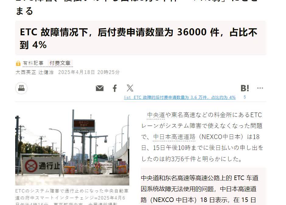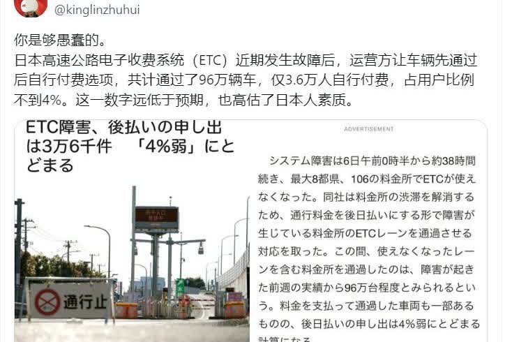 给我整笑了…… “日吹”写“意林”,被人当场啪啪打脸。 注意看下面这张图,节目效果拉满了[捂脸] 先看看他是怎么吹的。 说是日本的一个收费站,ETC系统出了问题,没办法计费了。 于是先让所有人通行,并希望他们事后自觉补票。(图1) 最后发现,大约有两万四千人,真的补票了。 这位“大殖子”很替日本高兴。 两万四千人啊!真棒!日本人就是有素质! 但事实是什么? 评论区有人直接打脸了(图2)…… 事实上,当天一共通过了96万辆车,最后只有3.6万人自行付费。 换句话说,真正有素质的人,比例不到4%…… 这一数字,远低于预期,也大大高估了日本人的素质。 大家再看看图3,笔者找到了新闻出处,比例不到4%是真的。 图1这个“大殖子”,故意隐瞒真正的信息,是什么用意呢? 看完这个“打脸”小故事,我不知道大家有没有一种似曾相识的感觉。 和我们以前看的那些,吹嘘日本和欧美的“小作文”, 套路是不是如出一辙? 那些“小作文”,往往抓住一个看似光鲜的点,断章取义地放大,刻意营造一种“外国月亮比中国圆”的假象。 他们通过精心挑选的案例,试图让人觉得国外的制度、文化、甚至人性都天然优越。 而一旦真相浮出水面,就像这不到4%的缴费比例,所谓的“日本人高素质”的神话,瞬间崩塌。 聊热点