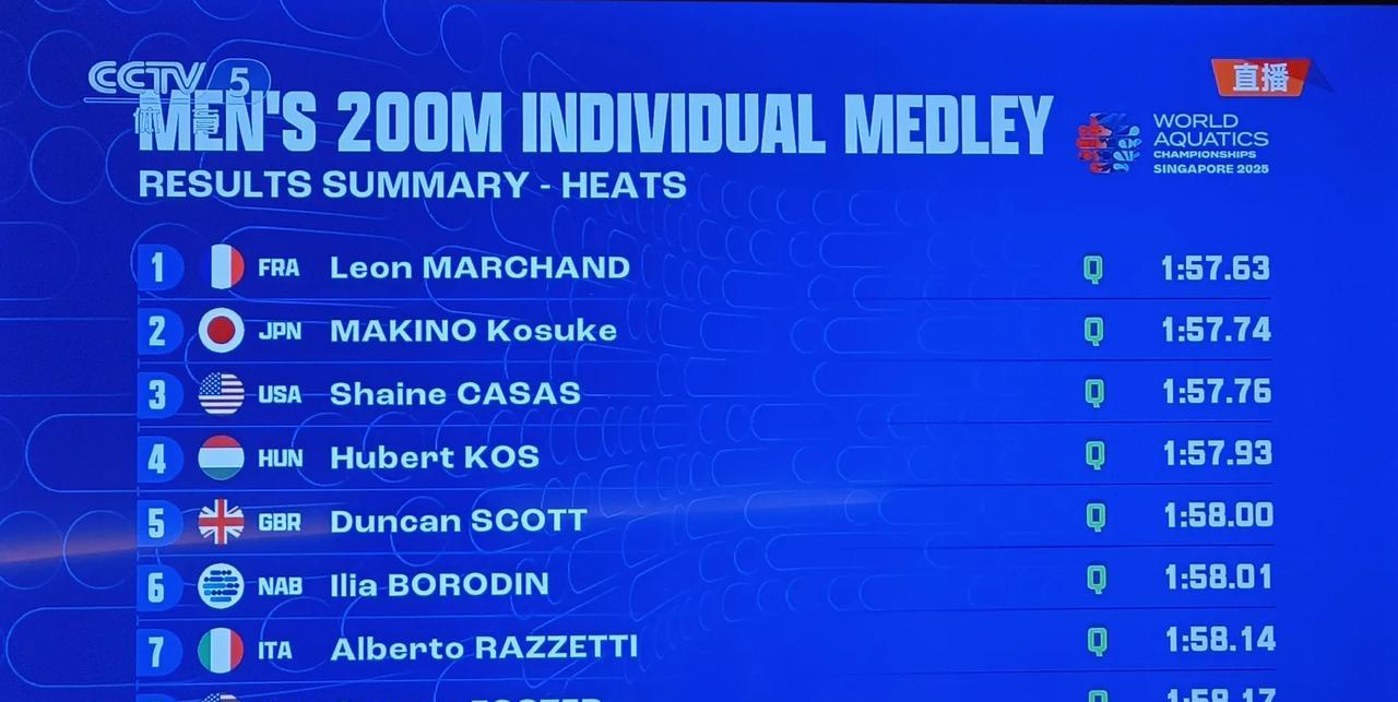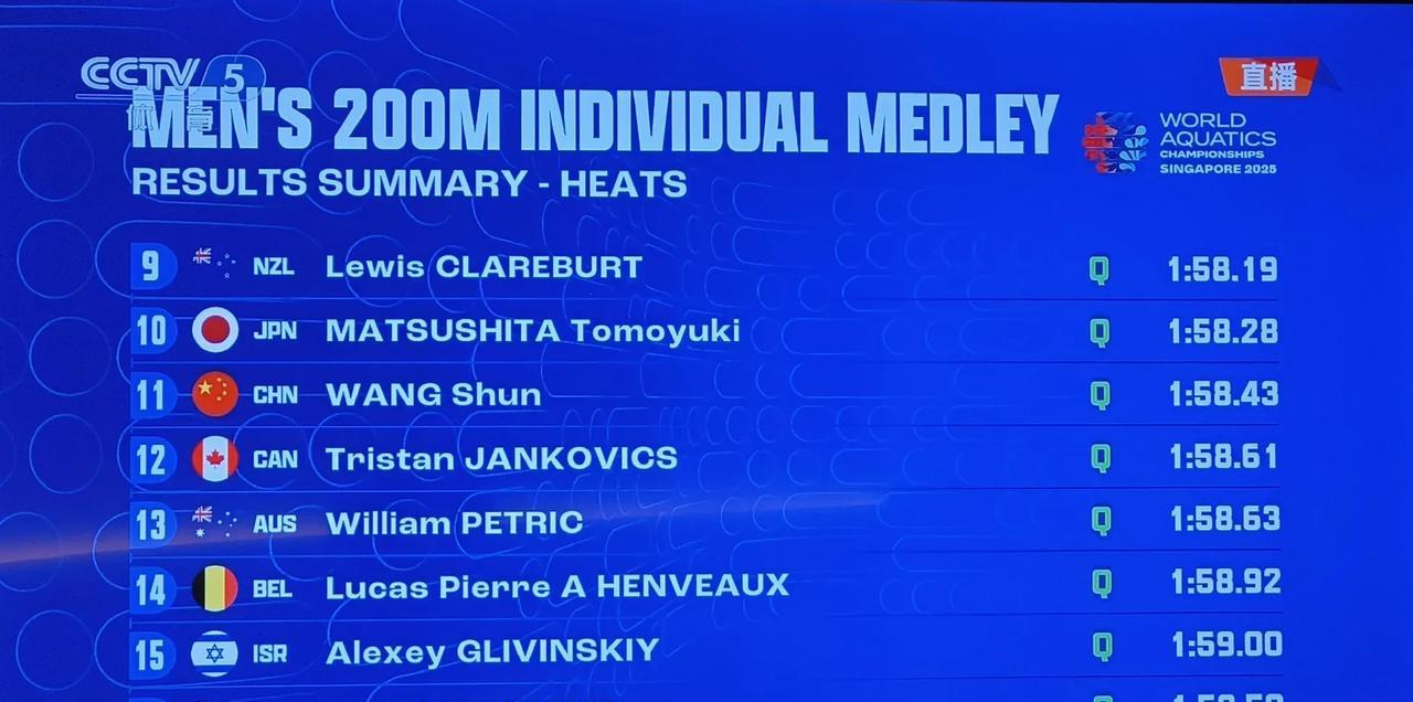 新加坡游泳世锦赛男子200米个人混合泳预赛,第八次参加世锦赛、东京奥运会该项目冠军汪顺游出1分58秒43的成绩,总排名第11,顺利晋级半决赛,巴黎奥运会四金王马尔尚以1分57秒43排名第一。