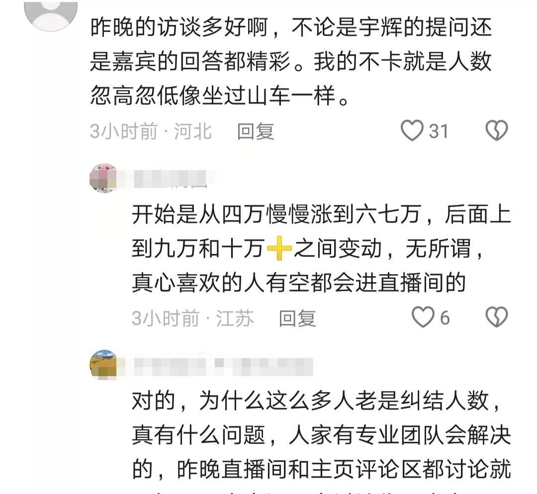 有朋友说,为什么他们老纠结十万+,是这个数字重要,还是董宇辉访谈的内容重要? 甚至有些朋友性子急,冲到评论区对导演、运营人员等,提了很多言辞激烈的建议。 昨晚董宇辉为此还特别留言,更新的新系统,小房子不兼容,所以人数才会不稳定。 部分有点卡,可能是系统的问题,可能是你自己手机发热卡或网速问题。 就这,解释的很清楚了,还有很多朋友议论纷纷。 评论区没多少人关心电影的内容,全在纠结人数上不去,是不是有点本末倒置了。 我想,董宇辉应该也不想这样。 一位朋友说得好,真心喜欢的人,还是多关注内容本身,专注作品。 人家有专业的运营人员,给他们一点空间,相信他们。 #董宇辉# #新锐创作者成长计划#