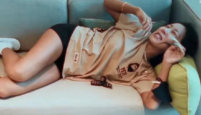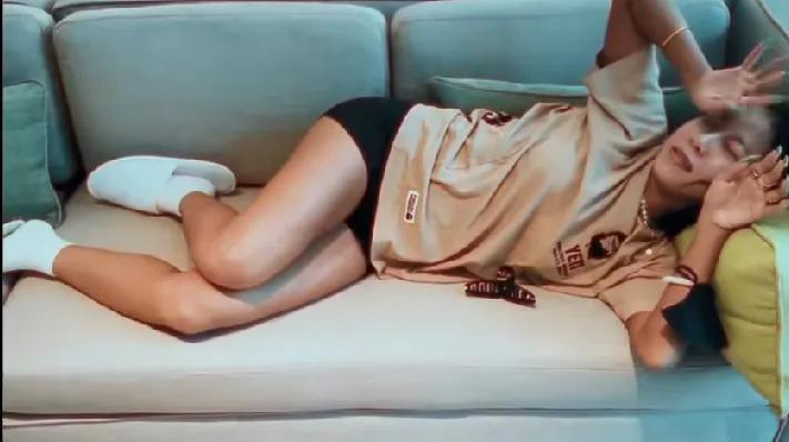 吉克隽逸躺在沙发上边哭边说瘦不下来肯定又要被说了,现在肚子还很饿,哭的特别委屈伤