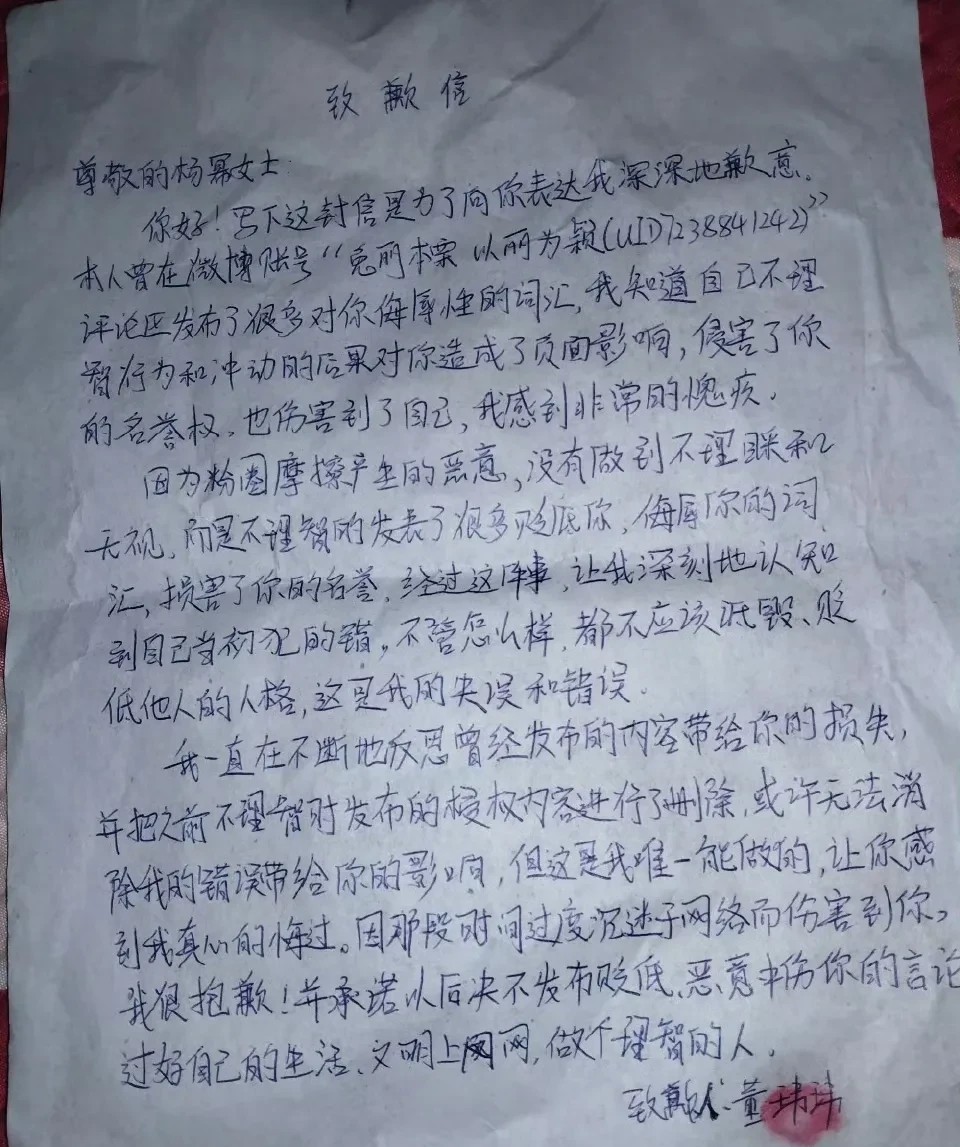 近日,赵丽颖粉丝因侮辱、谩骂杨幂,被法律判决视频+手写道歉信向杨幂道歉,网络不是