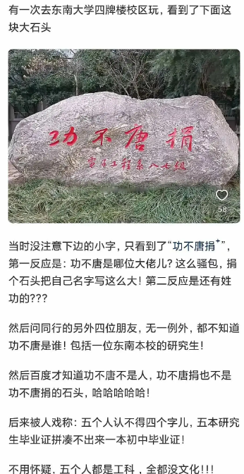 功不唐,八七级的老校友,这砣石头就是他捐的,你们这些人就是不仔细看,下面小字写着呢