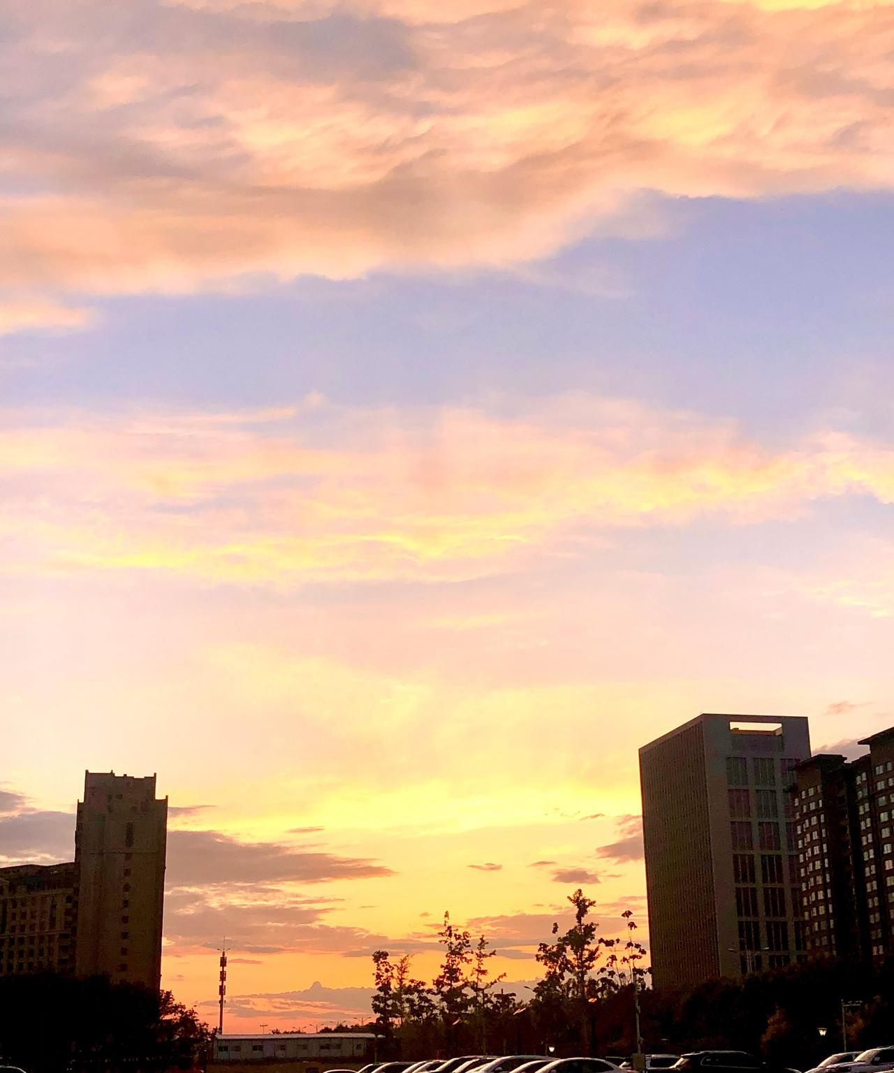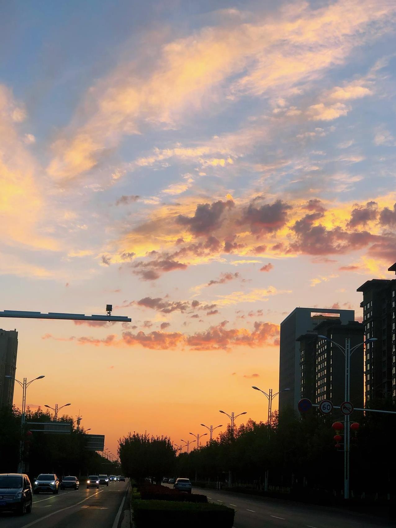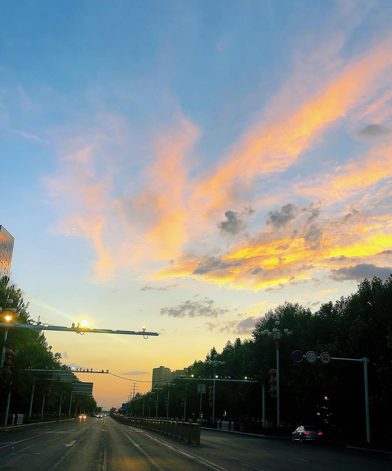 夏日里的晚霞如梦如幻,橘红、排紫与金黄交织成如揉碎的彩虹,将天空染尘流动的油画。