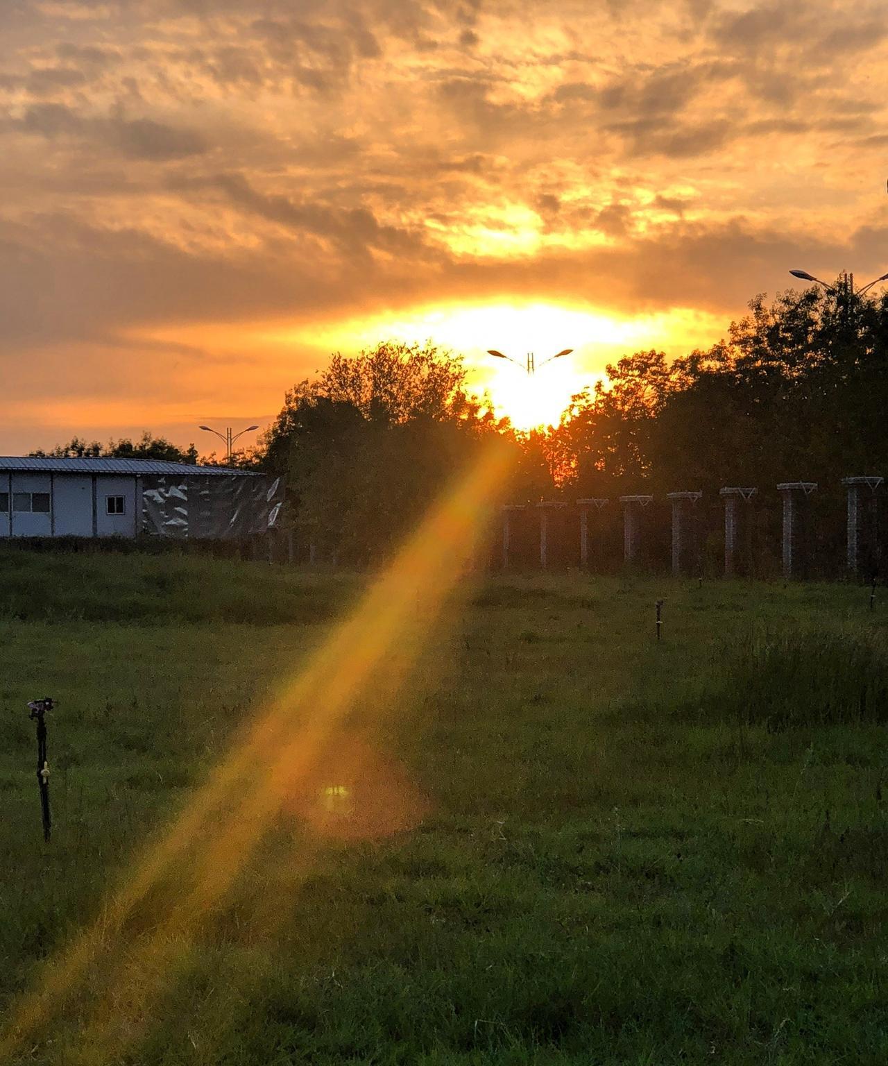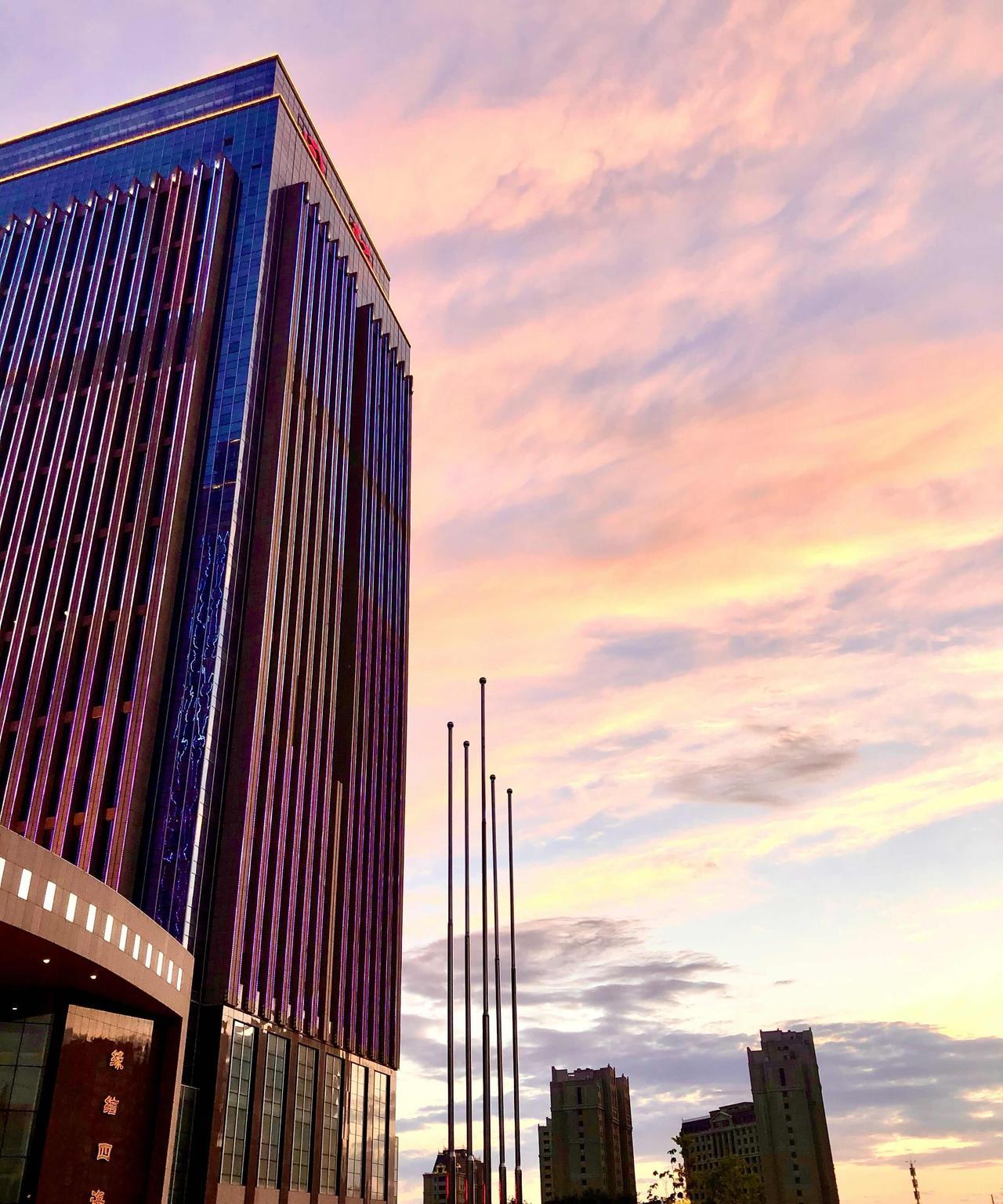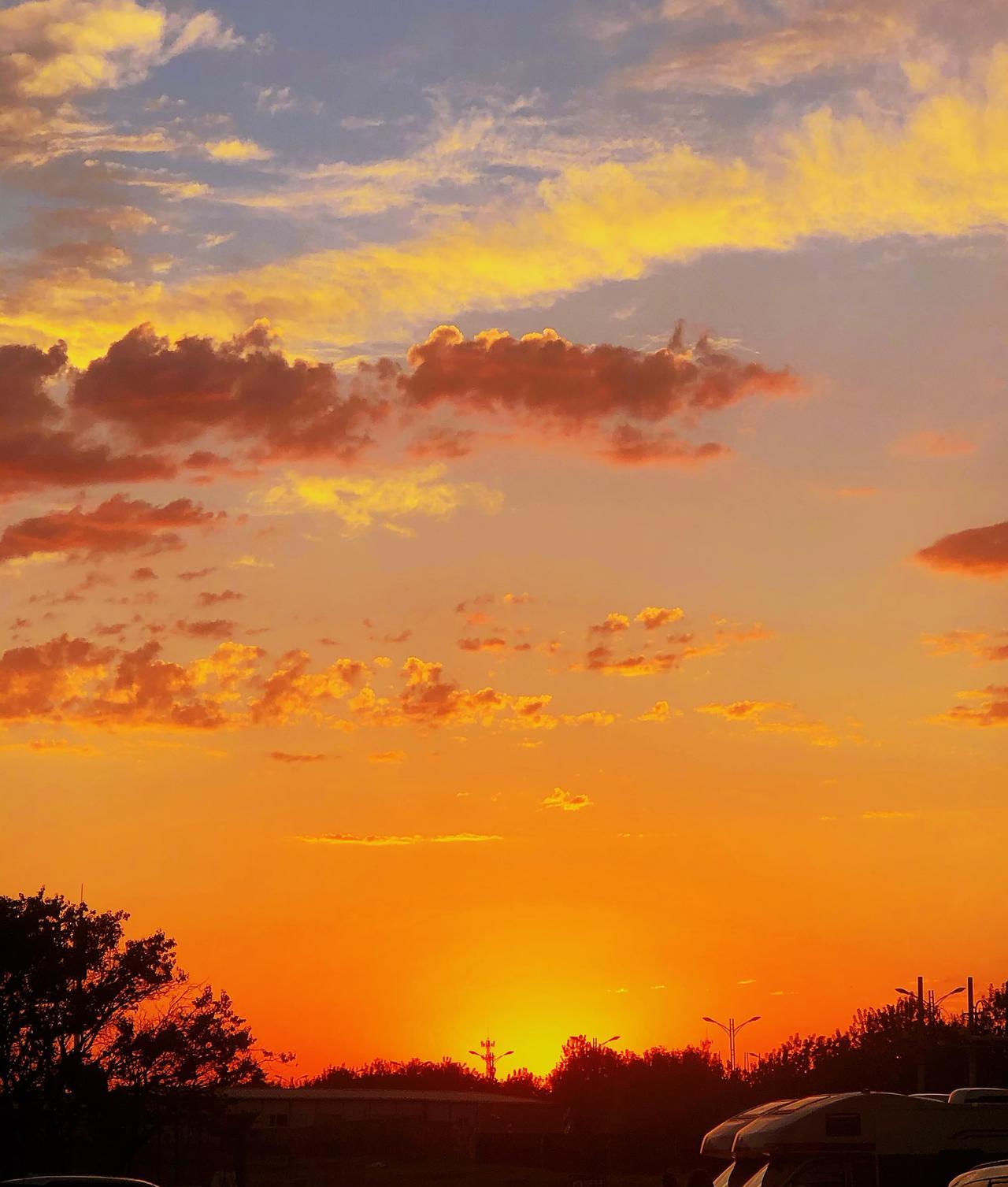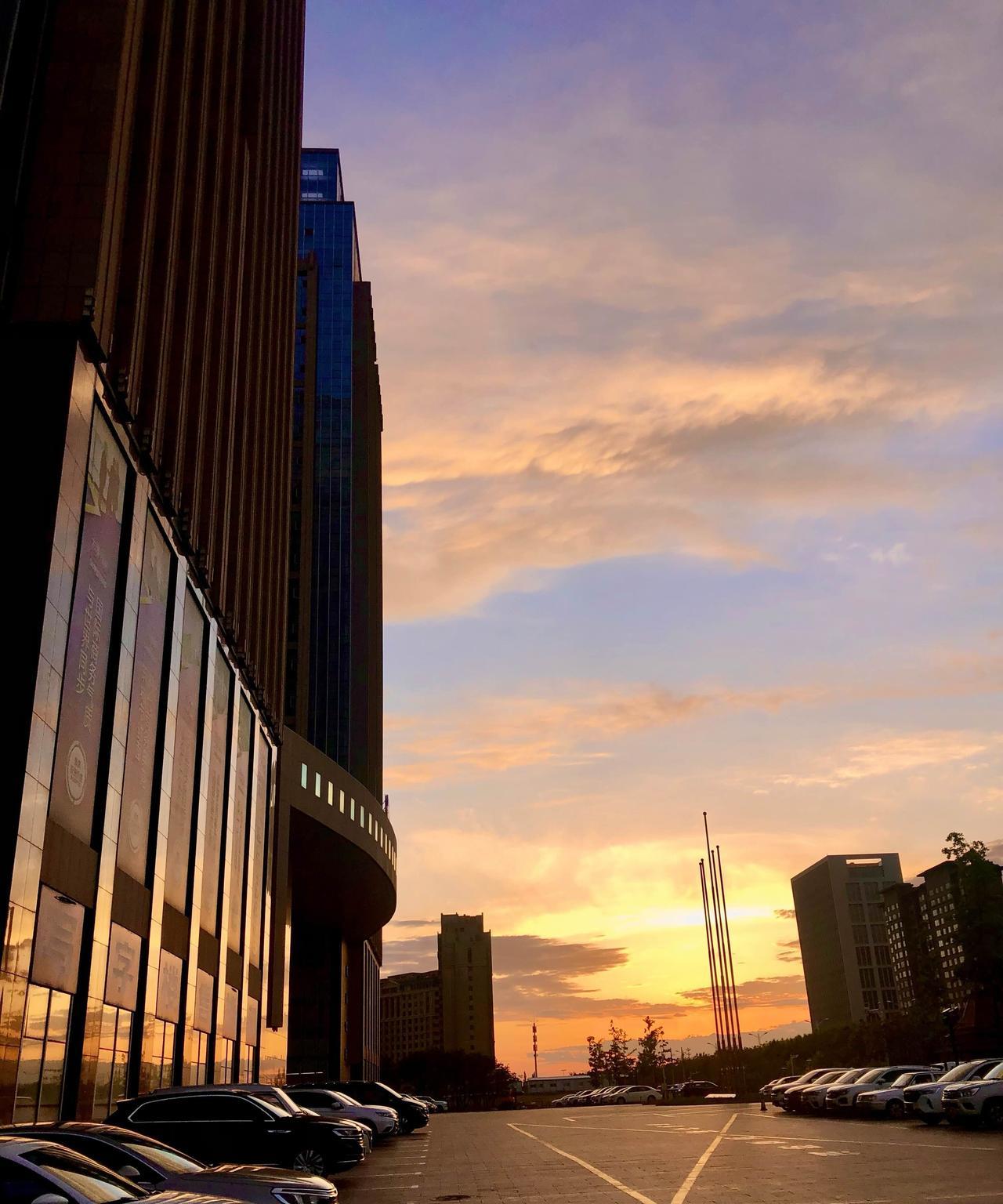 夏日里的晚霞如梦如幻,橘红、排紫与金黄交织成如揉碎的彩虹,将天空染尘流动的油画。