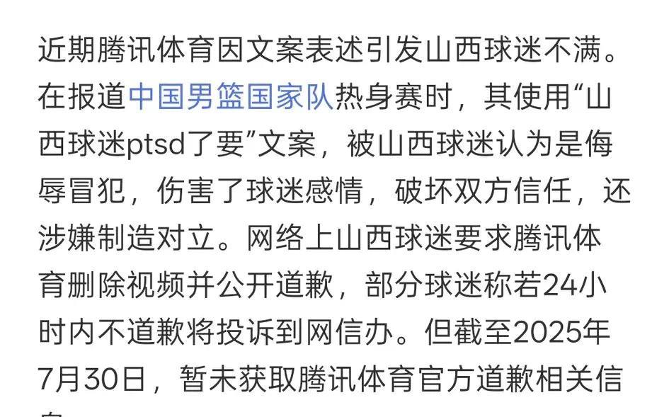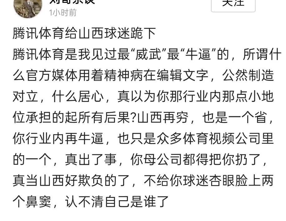 腾讯体育喊出不尊重且带侮辱山西球迷的话:山西球迷ptsd了要?请腾讯道歉! 昨天