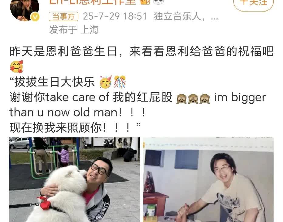 恩利为爸爸庾澄庆送上生日祝福! 7月29日,恩利工作室晒出恩利为爸爸庾澄庆64岁生日送上的祝福,晒出了两张庾澄庆不同时期的照片。 一张照片是现在的庾澄庆抱着大狗狗,一张是帮婴儿时小恩利换尿布。日期2002年4月,真的好早,23年前。 恩利为庾澄庆送上生日祝福,祝爸爸生日大快乐的同时,感谢了爸爸,发文:“…谢谢你take care of 我的红屁股 🙈🙈🙈 im bigger than u now old man!!! 现在换我来照顾你!!!” 哇偶,这一句现在换我来照顾你,感受到了恩利对爸爸的爱,也感受到了恩利的可爱。 好温馨的照片和话语。恩利成长的很不错。