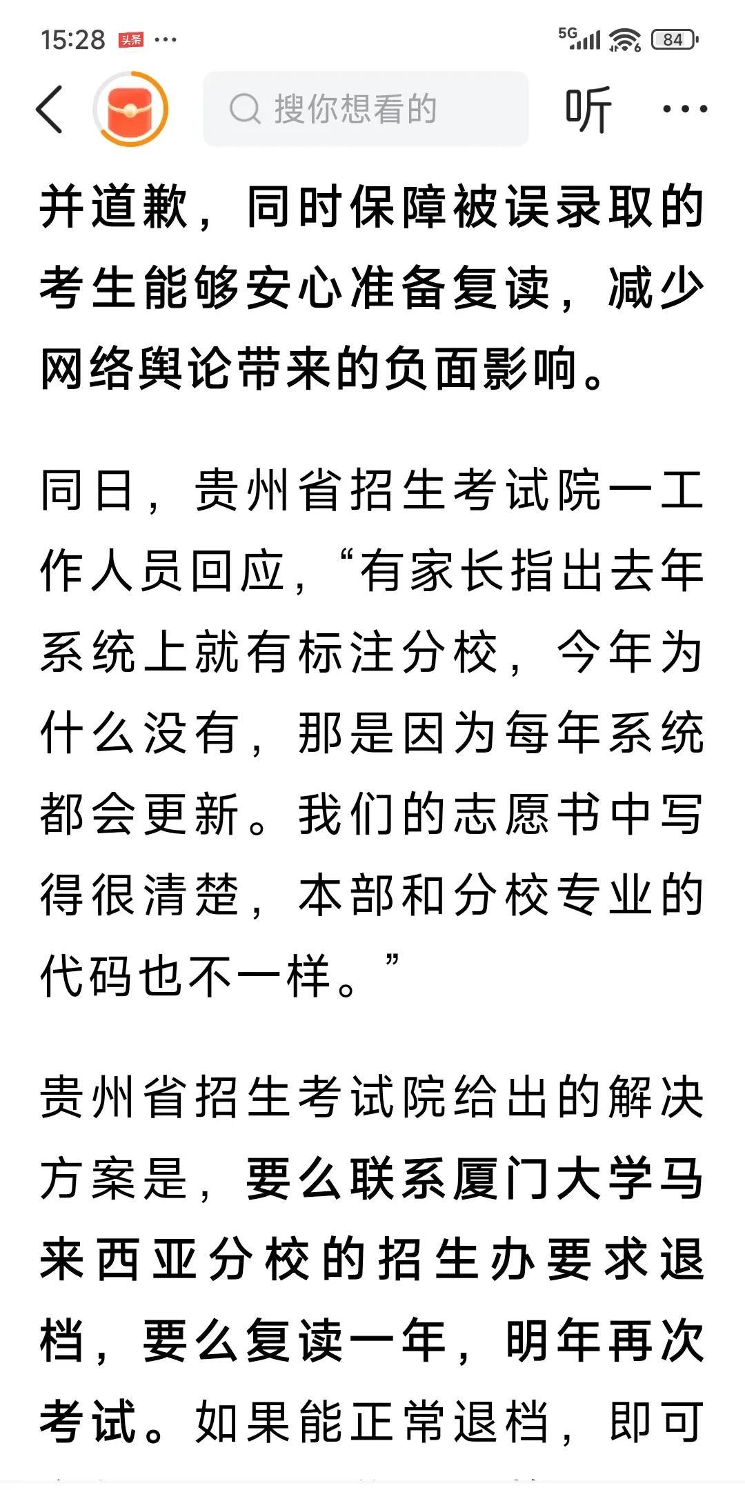 实在说不清了!贵州16名600分以上,学生,被误录入,厦门大学分校,在马来西亚校区,学费5.4万!当时报,考系统并未标注“分校”, 大家也认为是“厦门大学”!16个学生都出现了错误, 陈同学,是其中一名!他说考了626分,报名了,厦大计算机编号528,当时系统,并没有显示“厦大分校”字样, 厦大学费5000元,马来西亚分校5.4万, 有几人能读的起? 所以16人纷纷选择复读! 贵州回应,我们在“报考指南”书上有标注,因为系统升级,今年没有标注“分校” 现在大家都比较依赖,计算机报考系统, 有多少人注意,专 业说明, 书本上,写着,是“马来西亚分校”! 这真的是,数不清了! 可惜了16个,高分考生,只能选择复读!