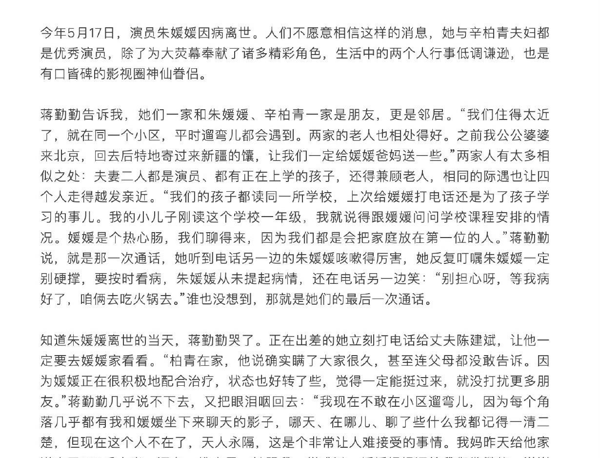 辛柏青家状况如何,终于有消息了![流泪] 作为邻居的蒋勤勤谈起他们家真的看哭人[流泪] 自从女儿朱媛媛走后,她的父母就很少出门,老人家也不敢回老家,怕触景伤情又怕熟人问及。这两个多月一直在北京照顾外孙女,帮衬点辛柏青。 辛柏青更难,朱媛媛去世消息一出来,陈建斌就去了辛柏青家,当时辛柏青已经办完丧事回到北京家里头,却不敢让朱媛媛的父母知道。一个人明明那么痛苦了还要装作什么事都没有的样子。纸后来包不住火,所有人都很担心也很想知道辛柏青近况如何,自从朱媛媛走后到现在他的头像都还是黑色的。除了新更新的两条剧推,娱乐圈找不到他的消息,幸亏蒋勤勤透露。 但是知道了也依然心酸,如果不是还有父母和孩子要照顾,真怕他会随妻而去啊