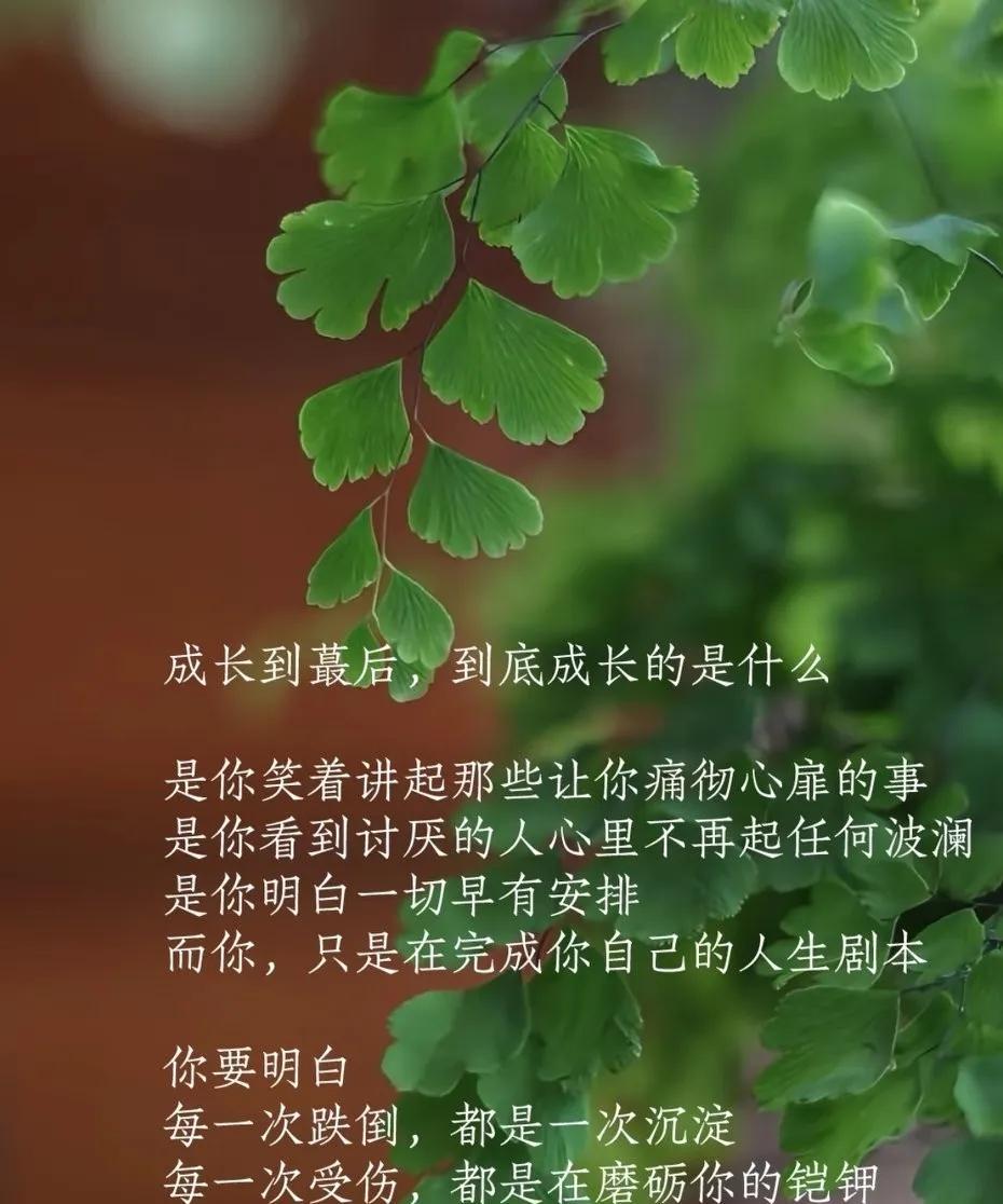 觉醒人生|凡事磨你,皆为渡你 王阳明说: “人间道场,淤泥生莲;世间磨难,皆是砥砺” 老天要你成长 不会给你一手好牌 人没有痛苦 是不会真正觉醒的 你以为成长就是功成名就 其实真正的成长 是在一次次跌倒又爬起的过程中 那些让你夜不能寐的困境 那些让你咬牙切齿的人 不是来折磨你的,而是来渡你的 他们像一把无情的刻刀 把你身上的浮躁、傲慢、脆弱、恐惧 一层层削去,露出更坚韧的本相 如果你一遇到挫折就崩溃 说明你的内心还不够强大 如果你总是被同样的问题绊倒 说明你还没真正学会这一课 所以啊,别抱怨命运不公 有些苦,熬过去几次,哪怕你当时狼狈不堪 回头再看,你会发现 不是世界对你温柔了,而是你变强大了 成长到蕞后,到底成长的是什么 是你笑着讲起那些让你痛彻心扉的事 是你看到讨厌的人心里不再起任何波澜 是你明白一切早有安排 而你,只是在完成你自己的人生剧本 你要明白 每一次跌倒,都是一次沉淀 每一次受伤,都是在磨砺你的铠钾 所以,不必畏惧痛苦 反而要感谢那些让你成长的经历 因为正是它们 让你从一块粗粝的石头 逐渐打磨成温润的玉