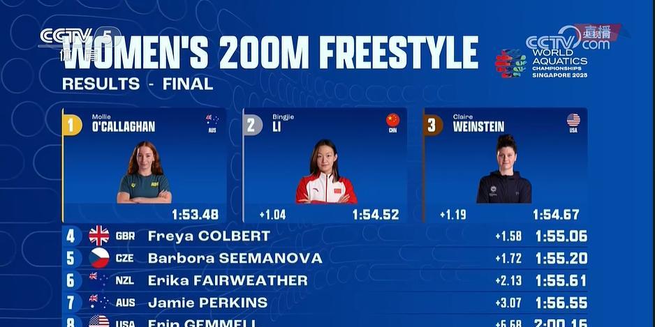 马尔尚200混半决赛碾压前世界纪录!中国队收获两银一铜,潘展乐爆冷无缘决赛,“劳模”李冰洁200自摘银。2025新加坡游泳世锦赛(27日-8月3日)第四比赛日赛果汇总。 决赛项目 男子800米自 冠军 贾瓦迪(突尼斯),成绩:7分36秒88(PB)。 女子200米自 冠军 奥卡拉汉(澳大利亚),成绩:1分53秒48;亚军 李冰洁(中国),成绩:1分54秒52(PB)。 男子200米蝶 冠军 乌尔兰多(美国),成绩:1分51秒87;陈俊儿第七名,成绩:1分55秒25。 男子50米蛙 冠军 切拉索洛(意大利),成绩:26秒54;覃海洋第三,成绩:26秒67。 男女4X100米混接 冠军 俄罗斯队,成绩:3分37秒97(新的赛会纪录);亚军,中国队(徐嘉余/覃海洋/张雨霏/吴卿风),成绩:3分39秒99。 半决赛项目 男子100自 潘展乐成绩48秒81,列第10位,无缘决赛。 女子50米仰 万乐天成绩27秒44,以第4名晋级决赛。 女子200米蝶 于子迪第8,以2分07秒95晋级决赛;马永慧位列第11位无缘决赛,成绩:2分08秒59。 男子200米混 马尔尚(法国)创新世界纪录1分52秒69,第1晋级决赛;汪顺第7顺利晋级,成绩:1分57秒48。