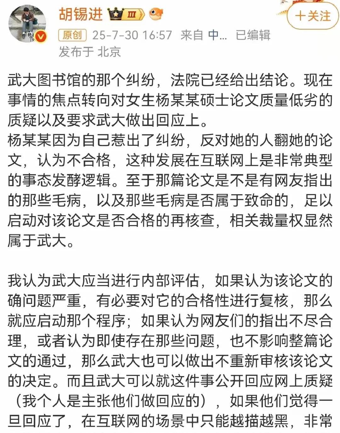 武汉大学这次对图书馆性骚扰事件舆论的应对处理真的非常不及格,堂堂一个名校居然让事件愈演愈烈真的不应该,不知道网友发文监督被有关机关上门的事情与武汉大学有没有关系,如果有关系,那武汉大学就更是出昏招。 其实这个事情处理很简单,对被诬告的肖同学予以恢复名誉,撤销处分,对诬告的杨同学予以通报,并且对杨同学发文公开嘲讽和威胁肖同学的事情予以调查。 很简单的事情,为什么武汉大学不回应,也不做呢?这才是最大的问题。