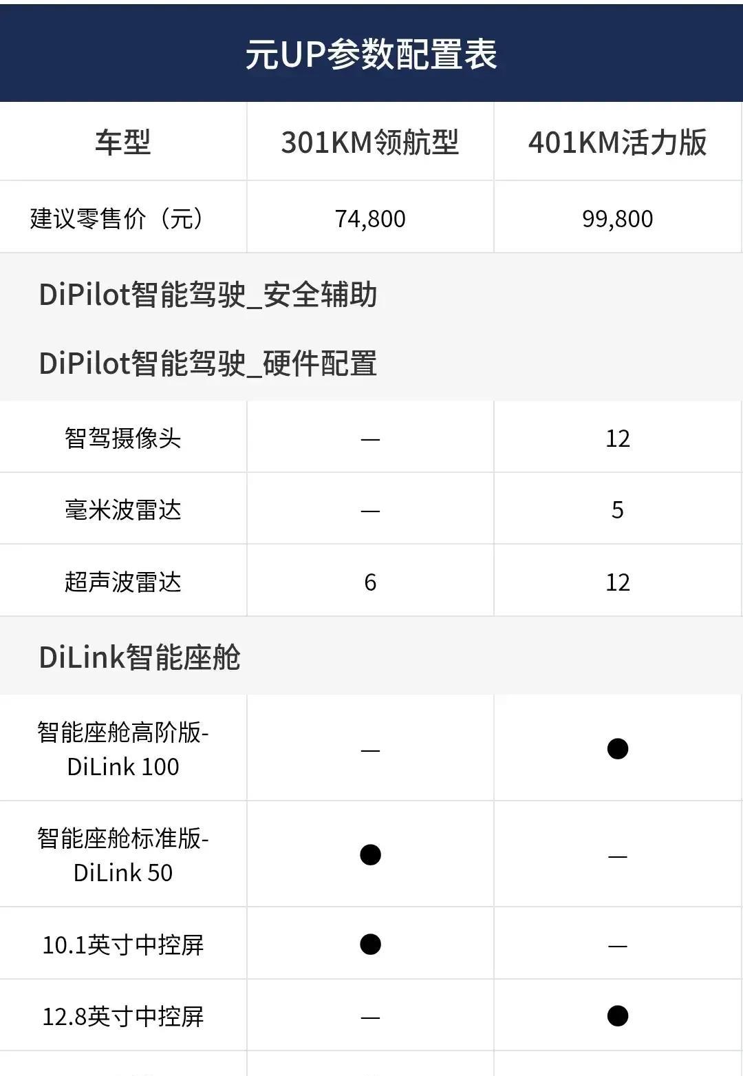 吉利用星愿打海豚海鸥,那比亚迪用元up反击星愿没毛病吧。 新的领航型续航里程301公里,比401公里的活力型少了100公里,价格也由99800降到74800起,足足便宜了2.5万,跟310公里的星愿价位差不多了。 领航型砍掉了智能辅助驾驶功能,所以只有6个毫米波雷达,有定速巡航够用了。没有哨兵模式和千里眼,但保留了全景影像还是不错的。 其他什么6年10万公里的质保也是一如既往的比亚迪标准,一体式车门激光焊接工艺就不必赘述了,迪子家是不会生产拼接车门的车子的。 4.3米的元up好歹也是个紧凑型SUV,空间表现和通过性自然不是a00级车能比的,这回代步车的准车主们满意了吗?