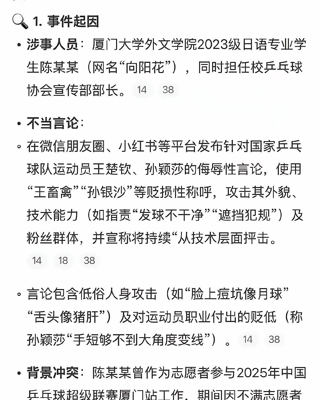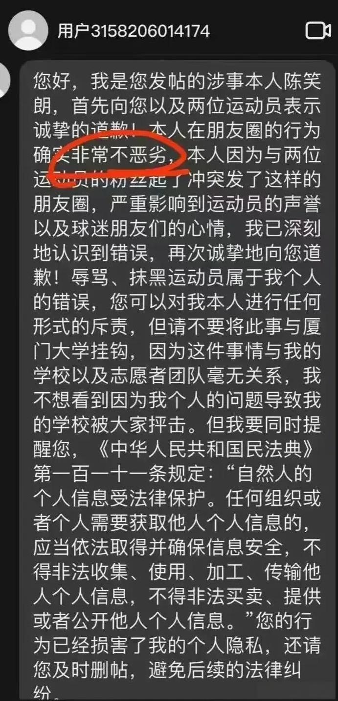厦门大学的陈笑朗,对运动员的伤害,光道歉就可以了吗?他的道歉其实还是在嘲讽,一点